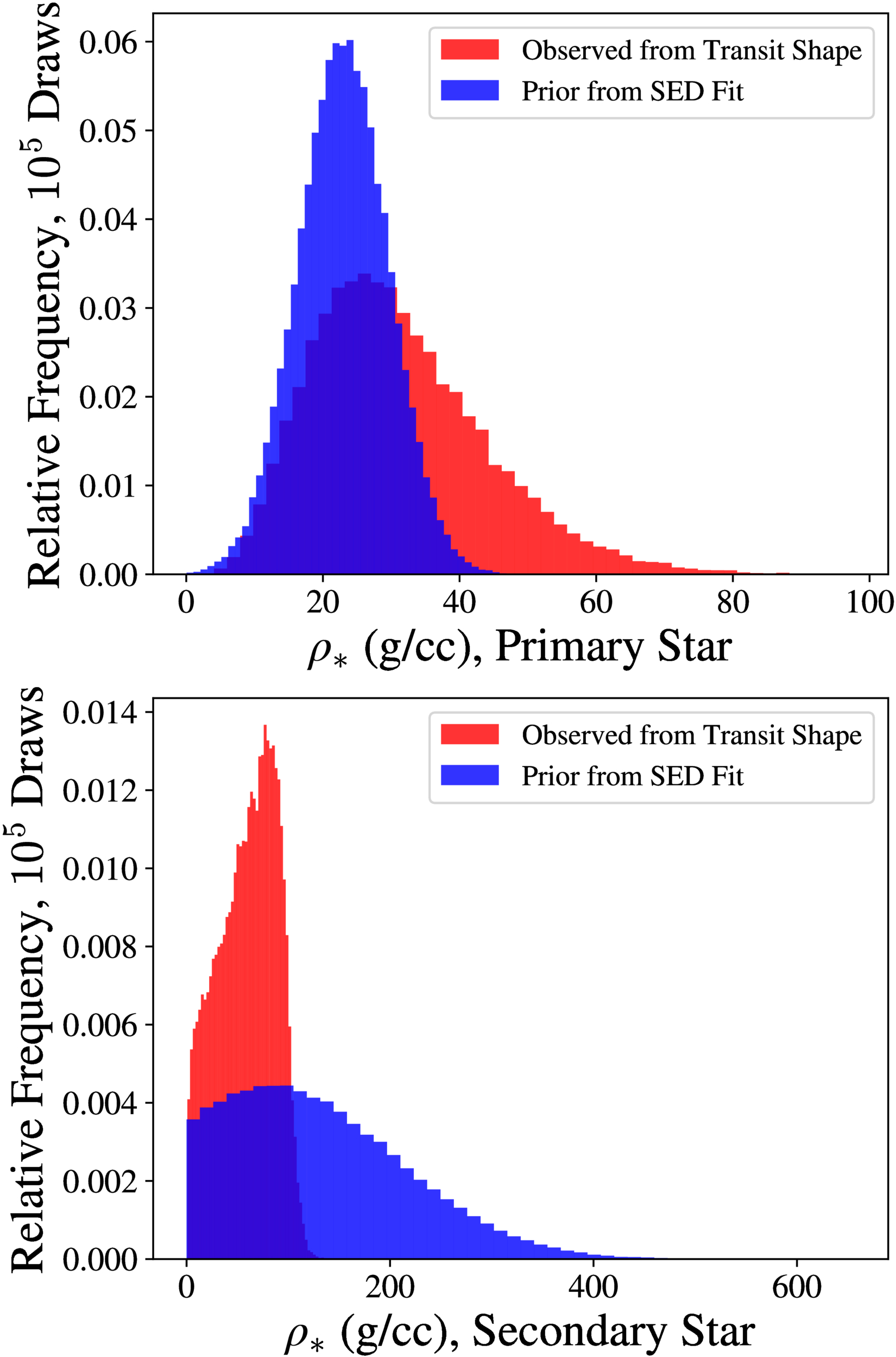 Empirical stellar density constraints derived from our transit shape analysis (red) compared to the stellar density measurements from the SED fitting of ZP25 (blue), for the primary (top) and secondary star (bottom) fits. Our empirical constraints on the stellar density are not precise enough to conclusively rule out either star as the host of TOI-2267 d.