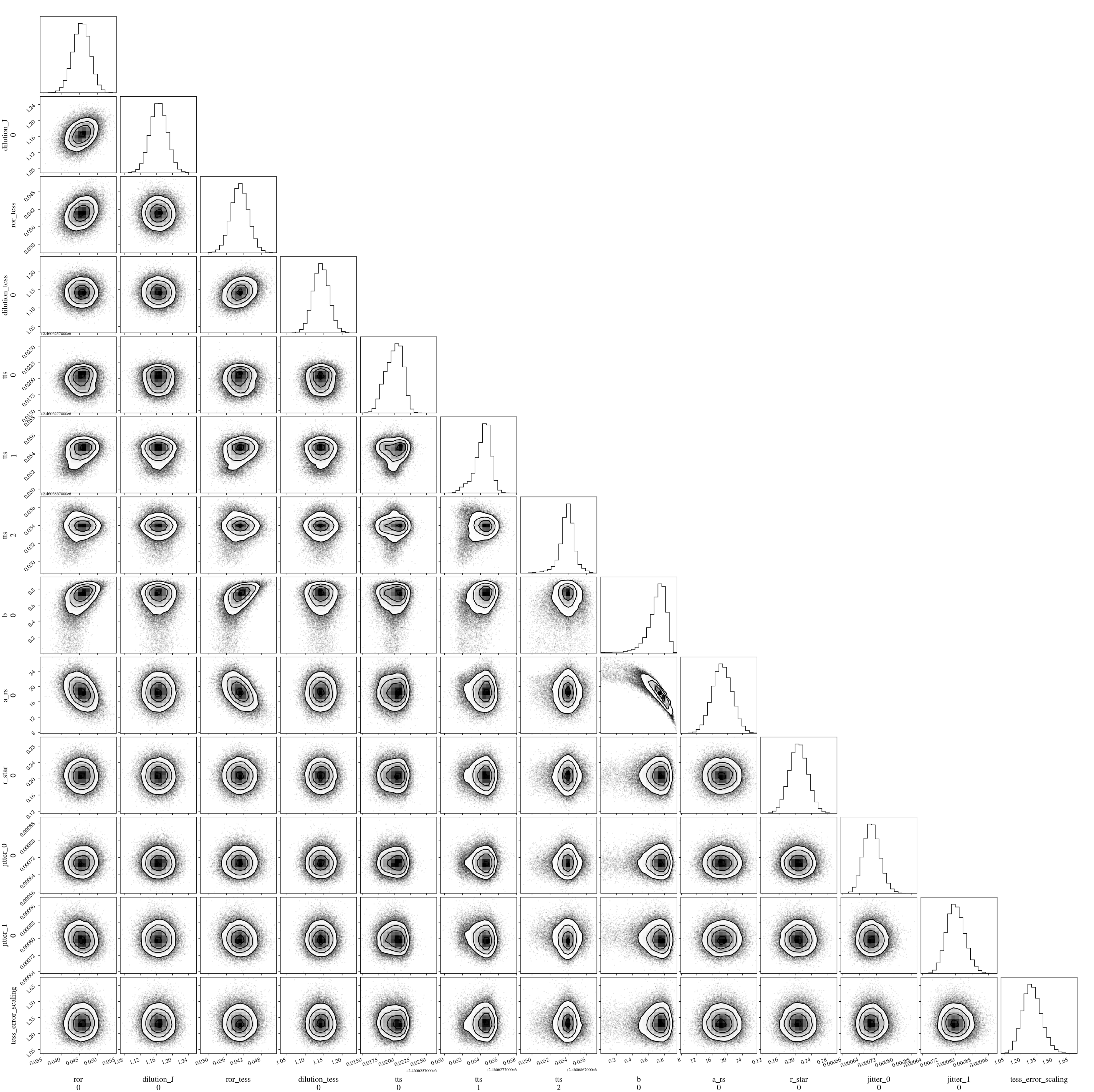 Posterior distribution of transit model parameters in our joint transit fit, assuming the primary host star, using both nights of Palomar/WIRC data and the phase-folded TESS photometry for TOI-2267 d.