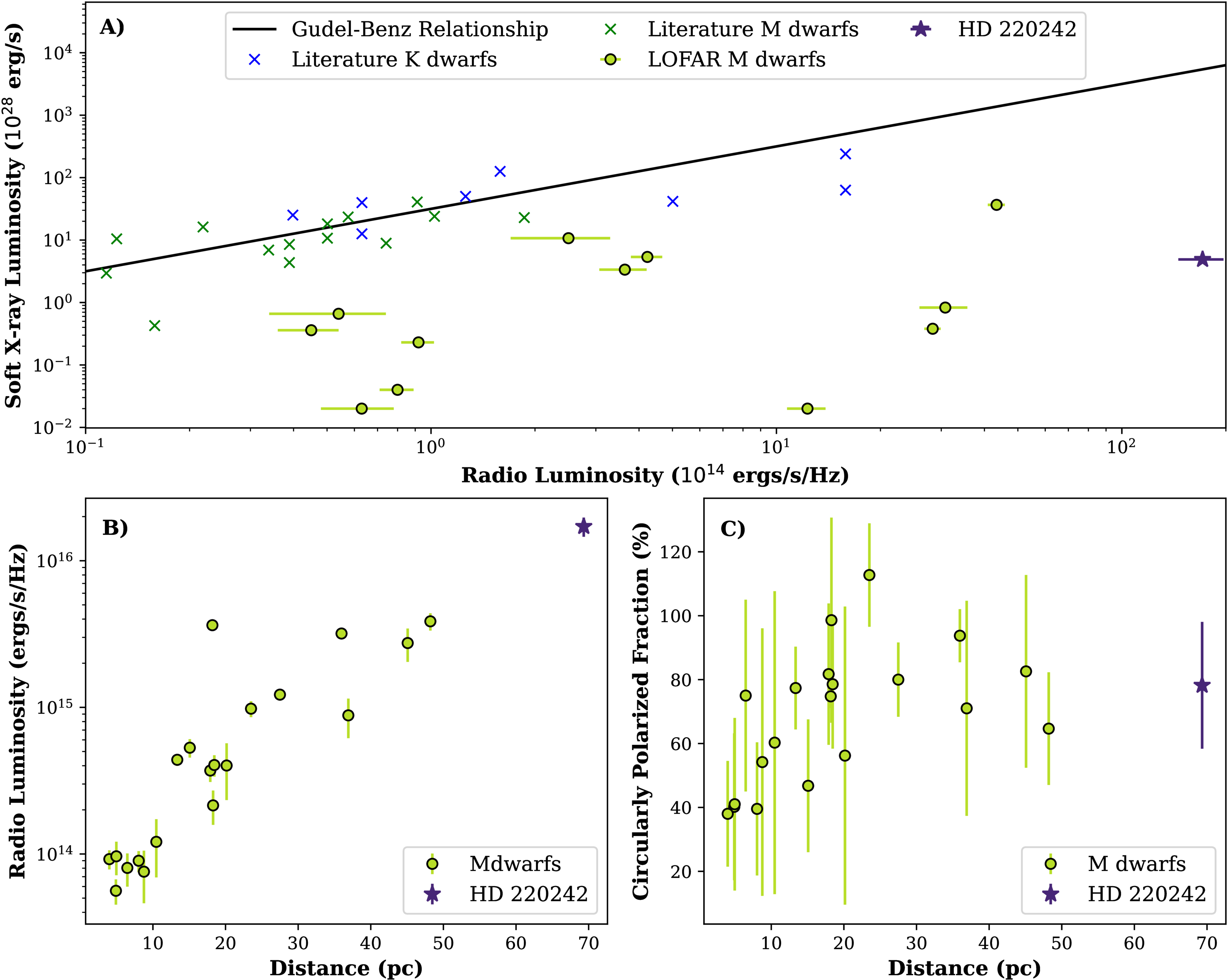 (A) Radio luminosities of the LOFAR M dwarf sample (J. R. Callingham et al. 2021) plotted against ROSAT X-ray luminosities. The canonical Güdel–Benz relationship (A. O. Benz & M. Guedel 1994) is plotted as a black line. Included for completeness are the M and K dwarfs originally used to calibrate the relationship (M. Gudel 1992; M. Gudel et al. 1993). While some members of the M dwarf sample lie within the expected scatter of this relationship, the total X-ray luminosity from the HD 220242 system falls far below the expected value if it were to follow this relationship. (B) Radio luminosities of the LOFAR M dwarf sample compared to HD 220242. (C) A comparison between the circularly polarized fraction of LOFAR M dwarfs and HD 220242.