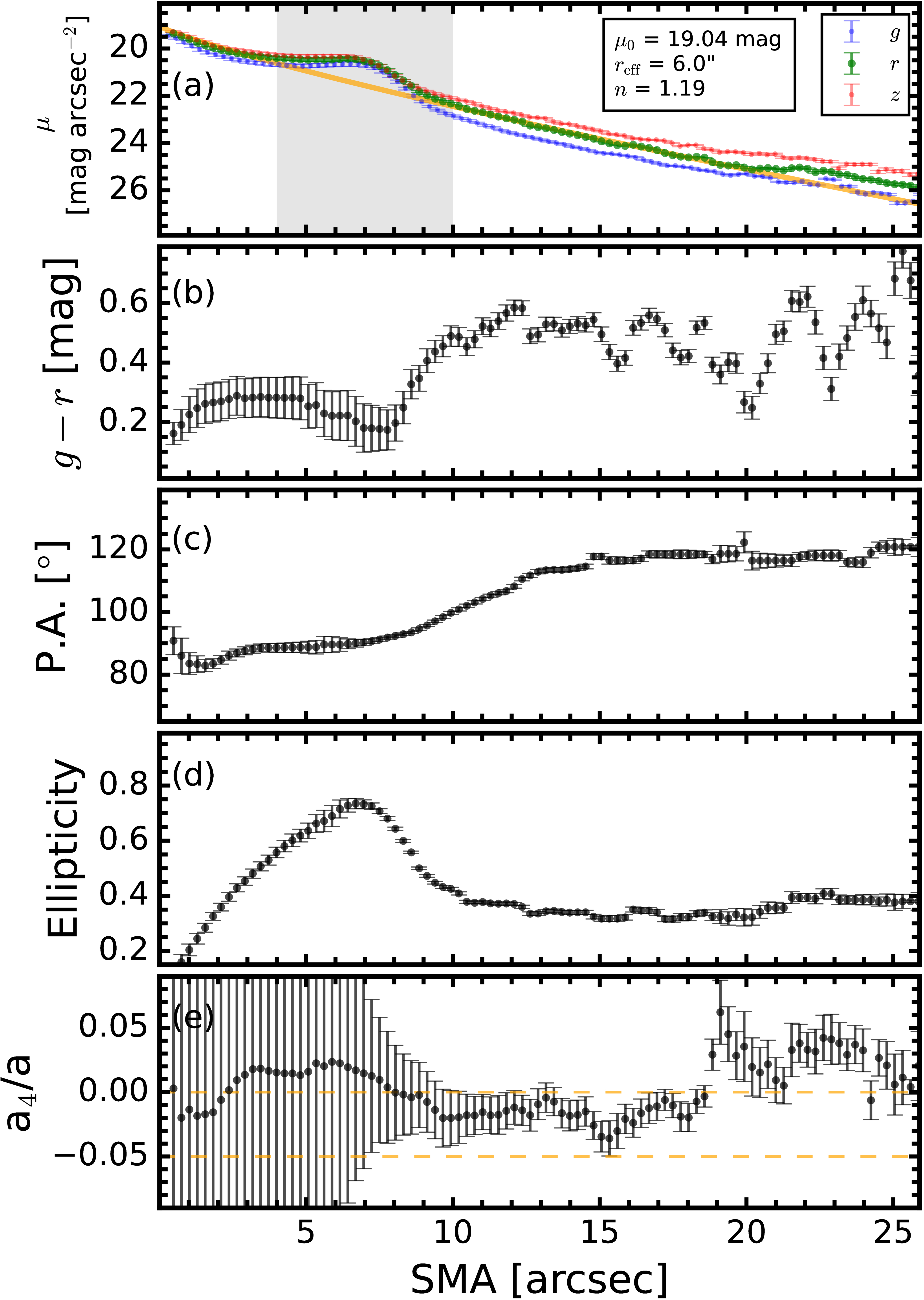 (a) Surface brightness profiles in the g, r, and z bands (blue, green, and red dots, respectively), (b) g − r color, (c) ellipticity, (d) position angle, and (e) a4/a parameter as a function of semimajor axis. In panel (a), Sérsic parameters are shown, and the gray shaded areas are excluded from the fitting process. The orange solid line represents the best-fit Sérsic function to the r-band profile. In panel (e), the horizontal orange dashed lines indicate a4/a values of 0.0 and −0.05.