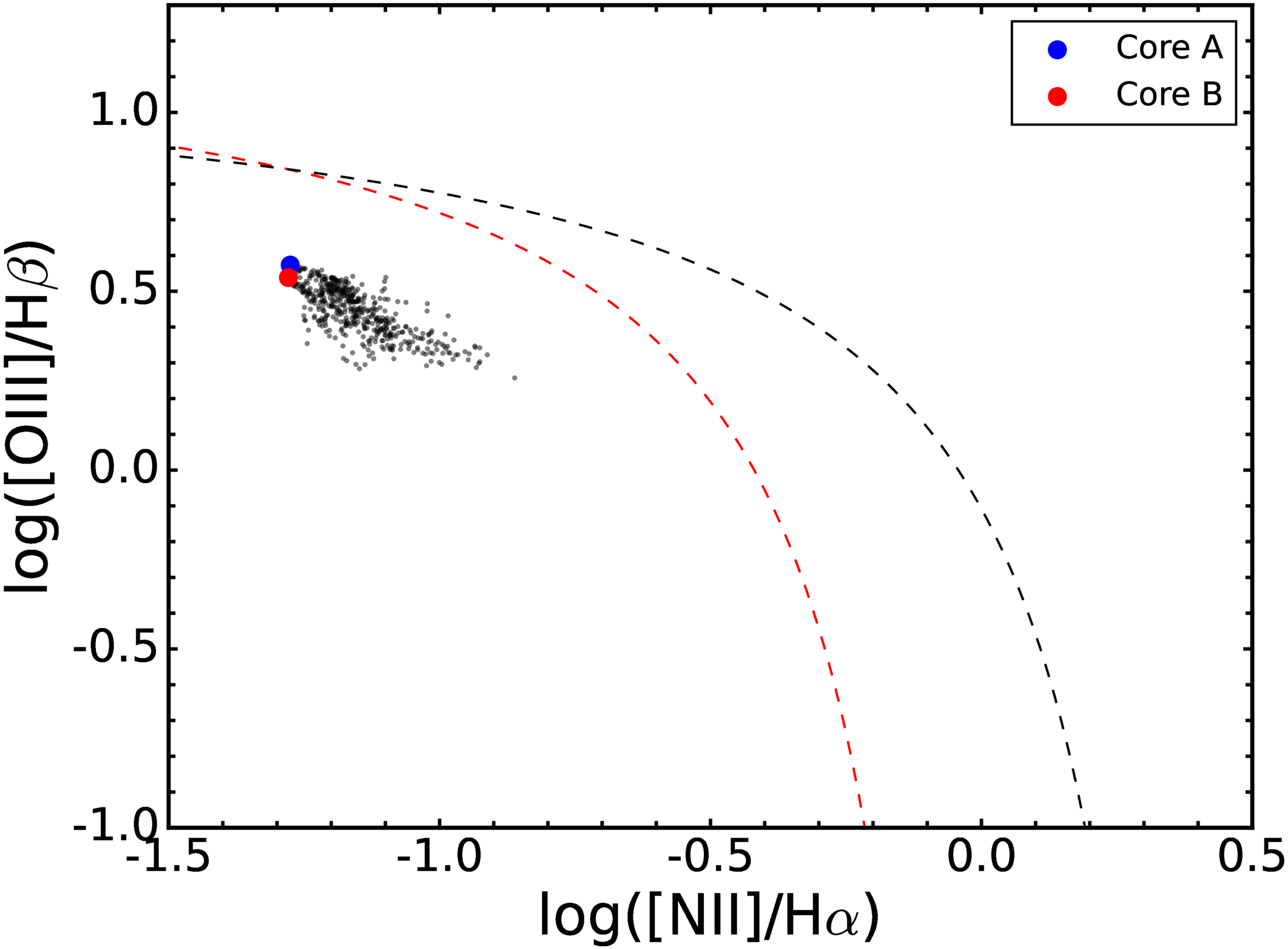 The BPT diagram for spaxels (black dots) of MCG+08-16-005 with an SNR > 10. The region above the black curve from (L. J. Kewley et al. 2001) indicates AGNs, while the area below the red curve from G. Kauffmann et al. (2003) indicates star-forming galaxies. Blue and red circles represent spaxels from Core A and Core B, respectively.