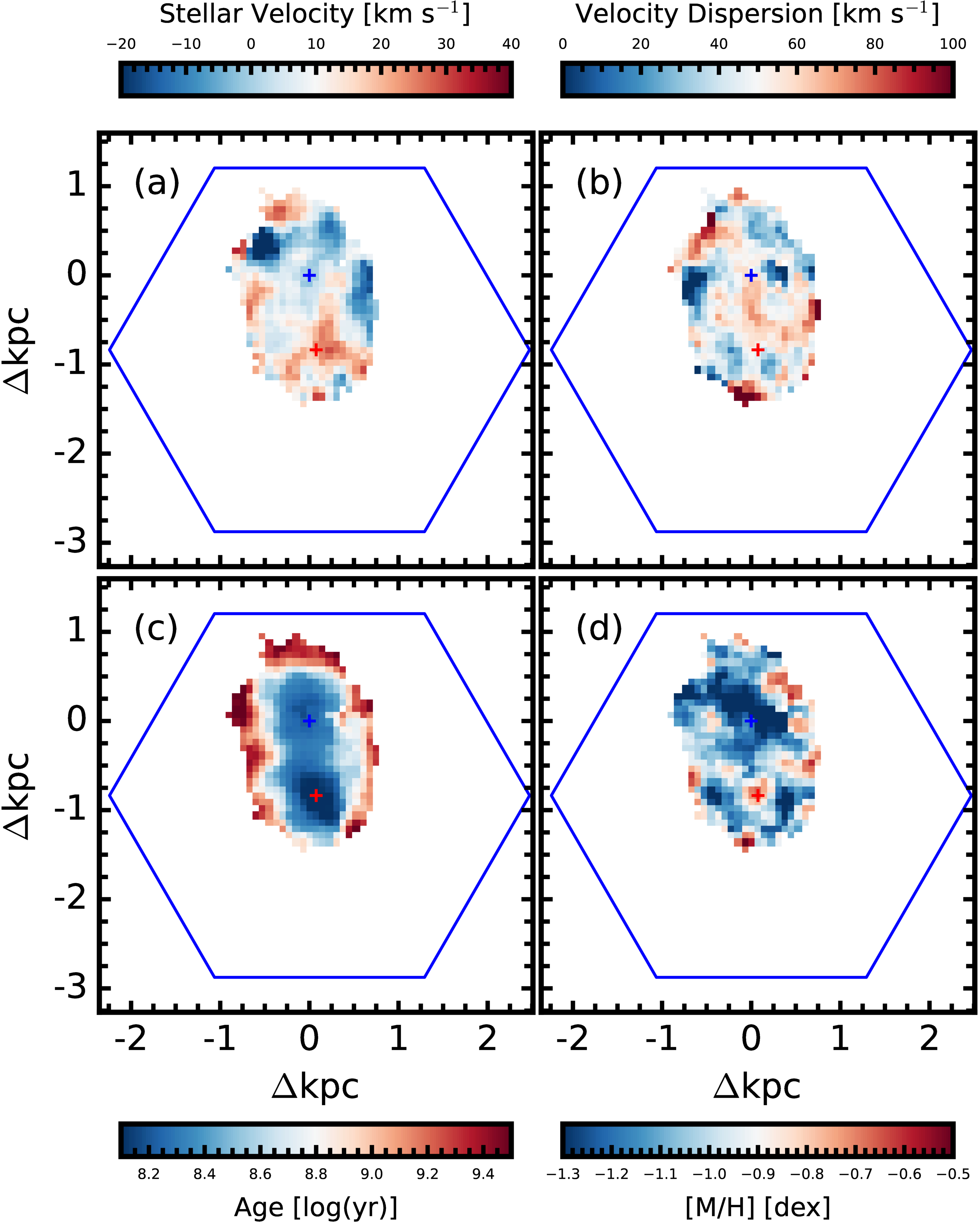 Stellar properties. (a) Stellar velocity, (b) velocity dispersion, (c) luminosity-weighted age, and (d) luminosity-weighted metallicity. The MaNGA field of view is outlined in blue in each map. Blue and red pluses mark the positions of Core A and Core B, respectively, as identified in the r-band image.