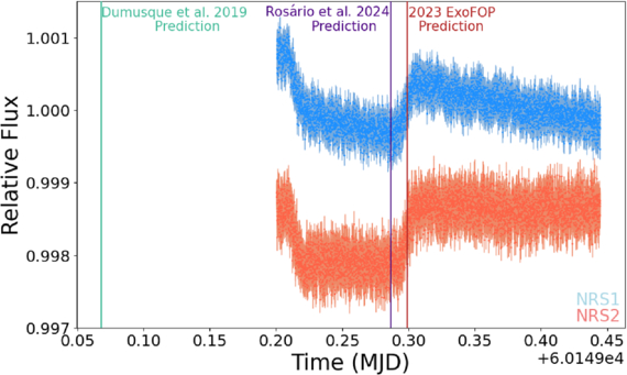 The white light curves from visit 1 of HD 15337 c with the predicted midtransit times from N. M. Rosário et al. (2024) in purple, from X. Dumusque et al. (2019) in green, and from ExoFOP in red. The transit of HD 15337 c occurred ∼44 minutes earlier than the time predicted from N. M. Rosário et al. (2024), ∼61 minutes earlier than the time predicted from ExoFOP, and ∼4.5 hr later than the time predicted from X. Dumusque et al. (2019).