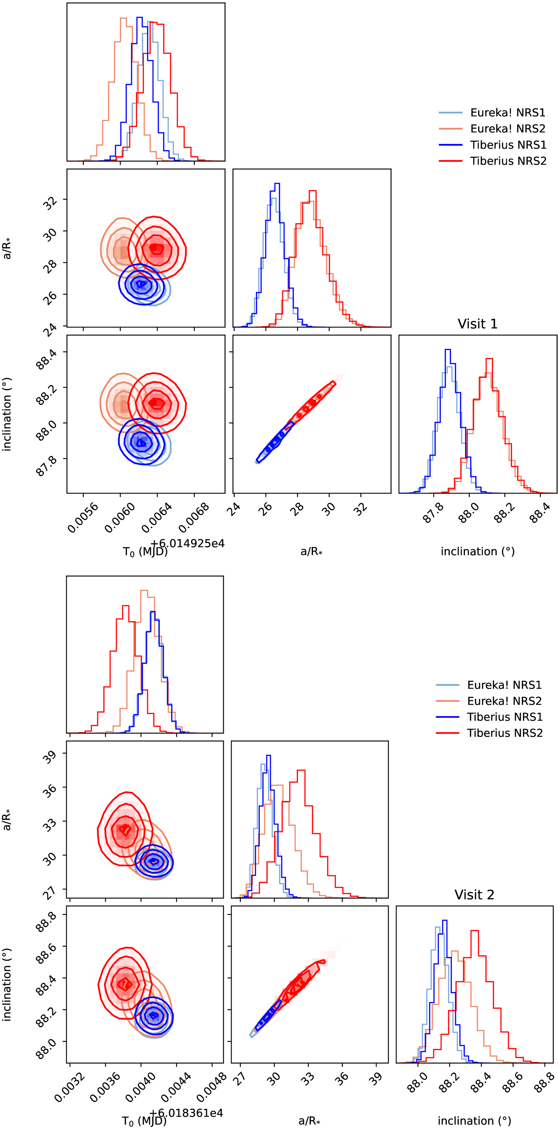 Results from the white light curve fits for visit 1 (top) and visit 2 (bottom) for the Eureka! and Tiberius reductions. There is good agreement between the reductions.