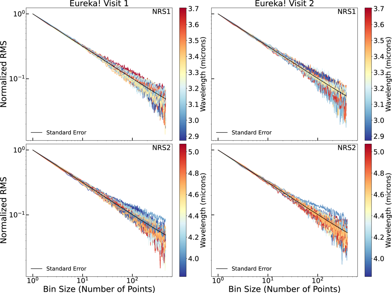 The plots of normalized rms vs. bin size for both detectors for both visits are shown for the Eureka! reduction colored by wavelength. The bins generally follow the black lines, which represent the standard error, and show that the residual noise seen in the white light curves (Figure 3) is not as evident in the individual spectroscopic bins, likely due to the larger noise in the bins.
