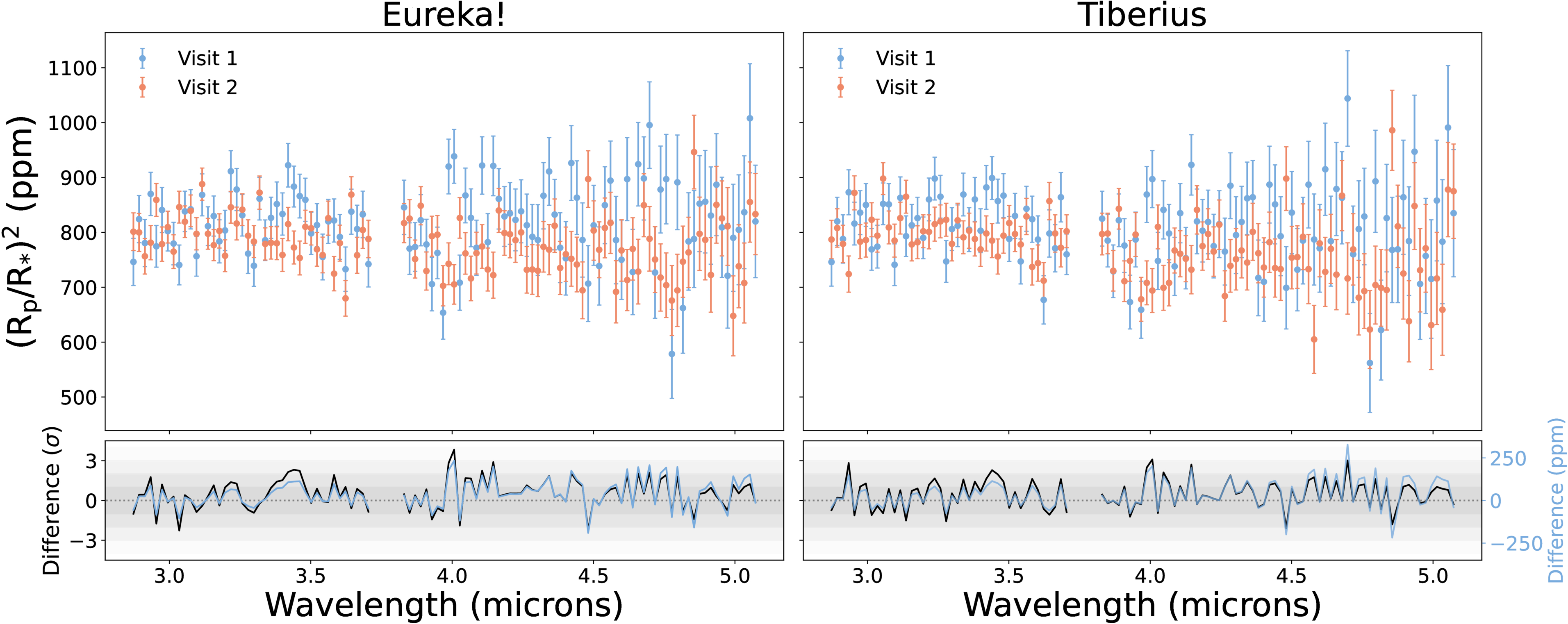 Spectra for both visits for each of the Eureka! (left) and Tiberius (right) reductions. We show the differences between the two visits within a reduction pipeline on the bottom panels in units of σ (black) and ppm (blue). While there are some differences between the visits, the points generally agree, with median differences of <1σ. Only two points in the Eureka! spectra and one point in the Tiberius spectra deviate by more than 3σ between visits.