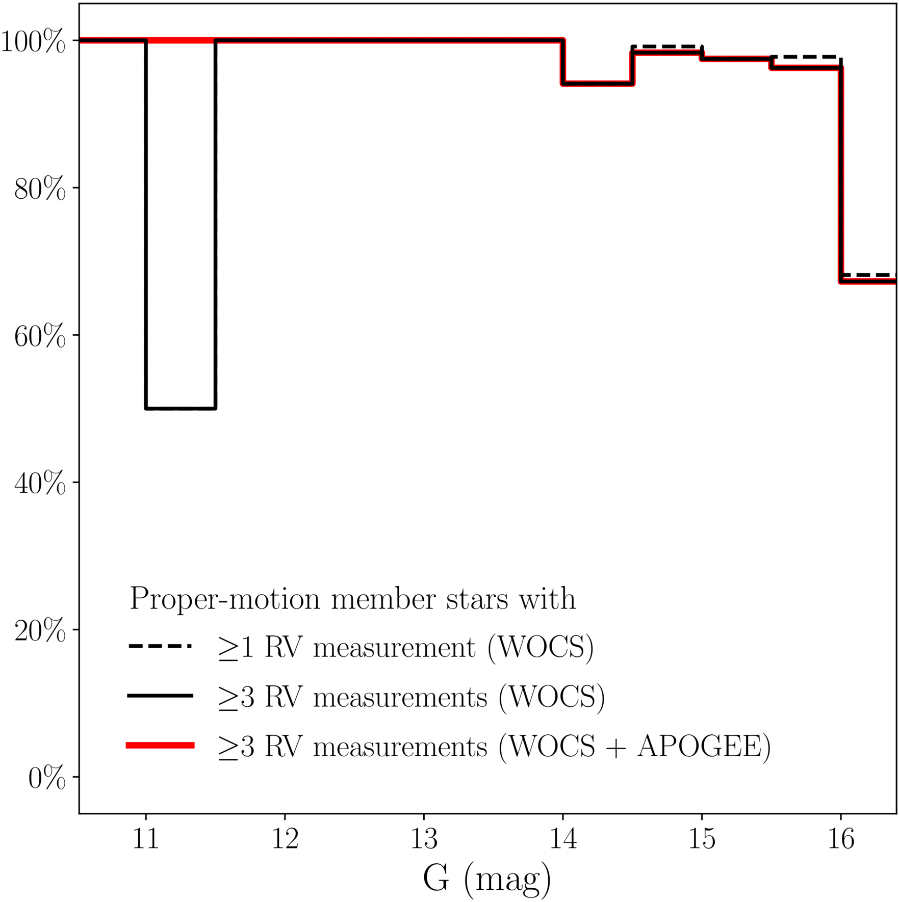 The percentage by G magnitude of proper-motion members that have at least one (dashed line) or three (solid line) RV measurements over a time interval of at least 2 yr. We show the completeness of our sample with only WOCS observations (black) and our full dataset (red).