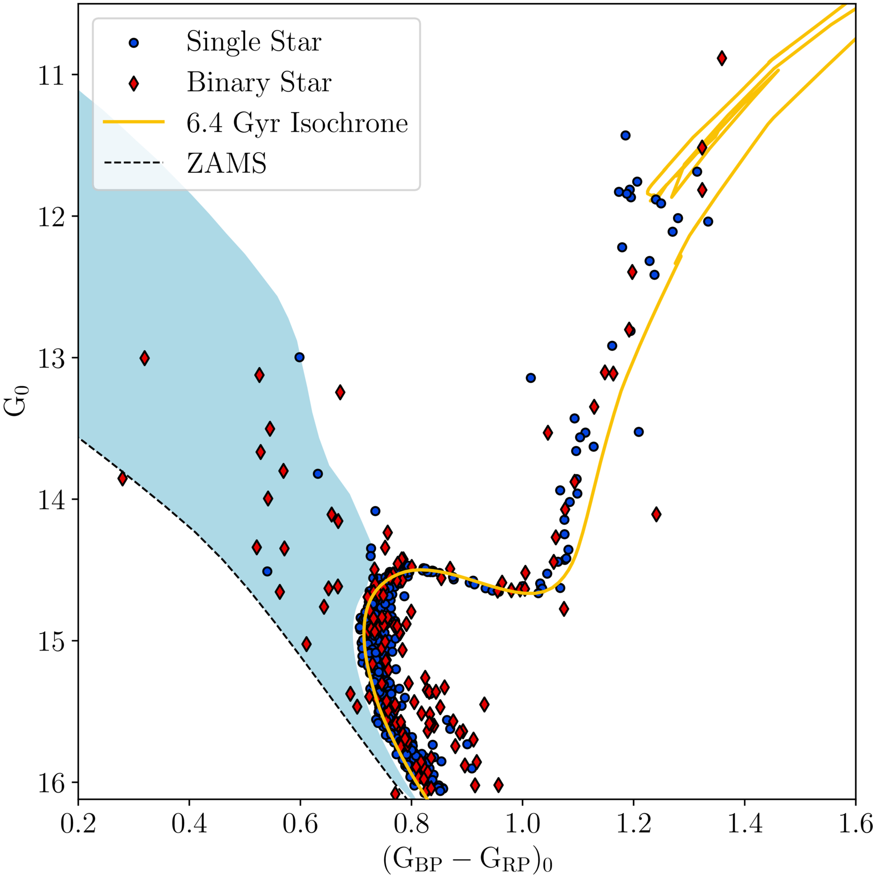 The color–magnitude diagram of member stars of NGC 188. Single stars are plotted as blue circles and binary stars are plotted as red diamonds. Stars have been differentially dereddened using the SFD dustmap along with an additional correction of E(GBP − GRP) = 0.0089 from our isochrone fit. The zero-age main sequence is plotted as a dashed line. Our best-fit MIST isochrone of 6.4 Gyr, [Fe/H] = −0.024 is shown as a solid line. The BSS region of NGC 188 is shaded in light blue. The upper bound is the terminal-age main sequence.