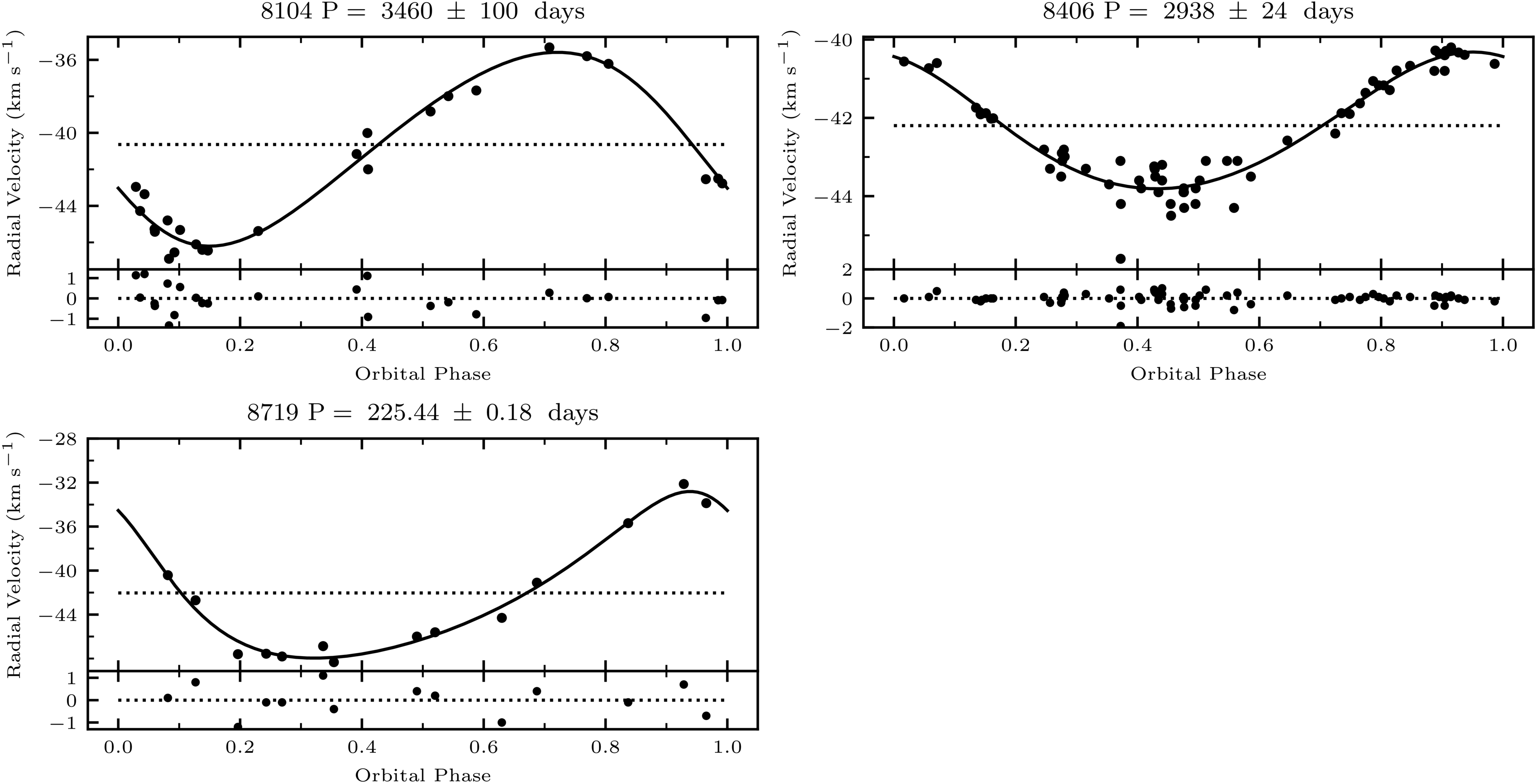 NGC 188 SB 1 orbit plots. For each binary in Table 6, we plot RV against orbital phase, showing the data points with black dots and the orbital fit to the data with the solid line; the dotted line marks the γ-velocity. Beneath each orbit plot, we show the residuals from the fit. Above each plot, we give the binary ID and orbital period.
