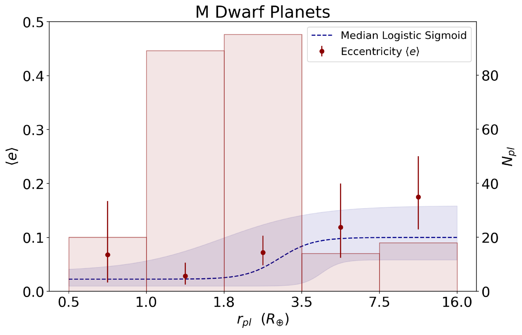 〈e〉 vs. planet radius bins for the sample of M dwarf planets (red points). The red error bars present the 16th and 84th percentiles of 〈e〉. The red histogram represents the number of M dwarf planets in each radius bin (right-hand vertical axis). The median logistic sigmoid model is plotted in dark blue. The 16th and 84th percentiles of the logistic sigmoid are denoted by the dark blue shaded regions.