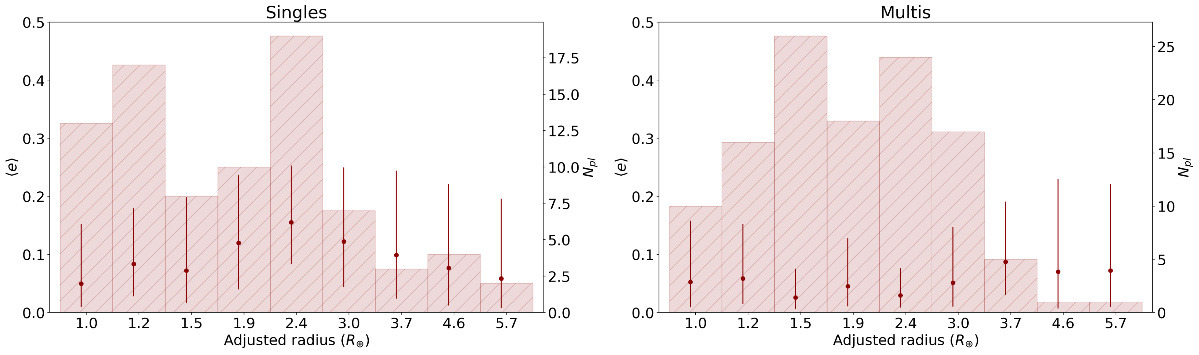 Left: 〈e〉 vs. adjusted planet radius radj bin centers for singles with 0.5 < radj < 5.1R⊕ (red points). The red error bars present the 16th and 84th percentiles of 〈e〉. The red histogram represents the number of M dwarf planets in each bin (right-hand vertical axis). Right: same as the left panel, but for multis.