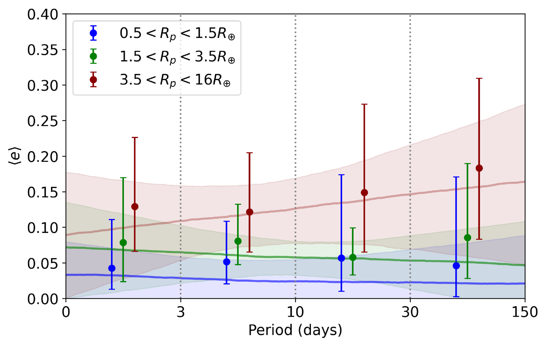 〈e〉 vs. orbital period for planets within three radius bins: 0.5 < Rp < 1.5R⊕ (blue), 1.5 < Rp < 3.5R⊕ (green), and 3.5 < Rp < 16R⊕ (red). The lines represent the best-fit linear model to each relationship, and the shaded regions represent the 1σ uncertainties. There is no significant relationship present between 〈e〉 and orbital period within any radius bin.
