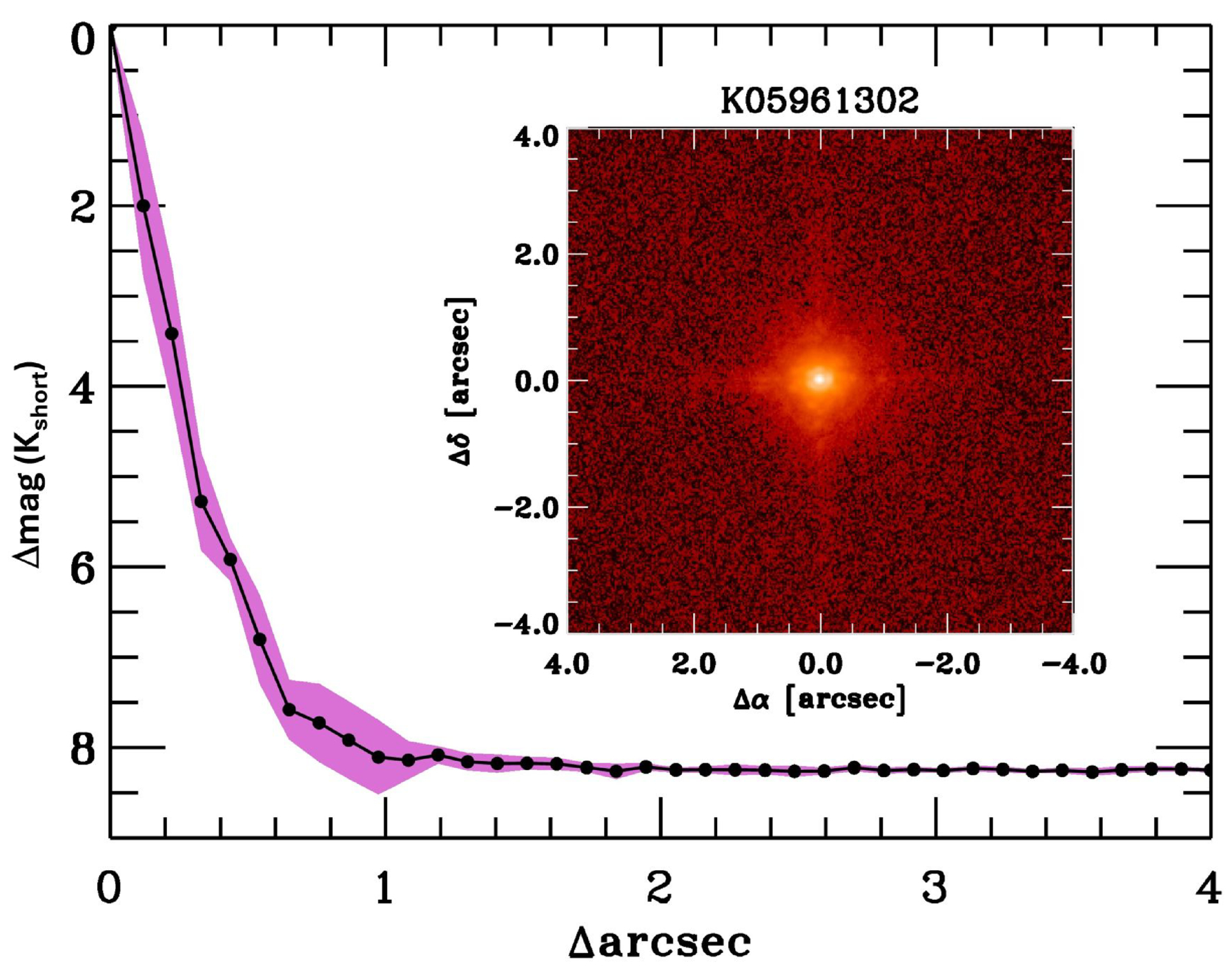 Example AO image and sensitivity curve for KIC 5961302, a V = 13.7 mag K4V Kepler target in our control sample. The resolution of the image is 0﹩\mathop{.}\limits^{\unicode{x02033}}﹩109 (FWHM of the PSF). The black points represent the measured sensitivity relative to the brightness of the target in FWHM radial steps from the target. The purple represents the azimuthal rms dispersion of the sensitivity measurements. The inset image is a 4″ zoom in on the target from the final fully mosaicked image, which was approximately 17″ × 17″ in size.
