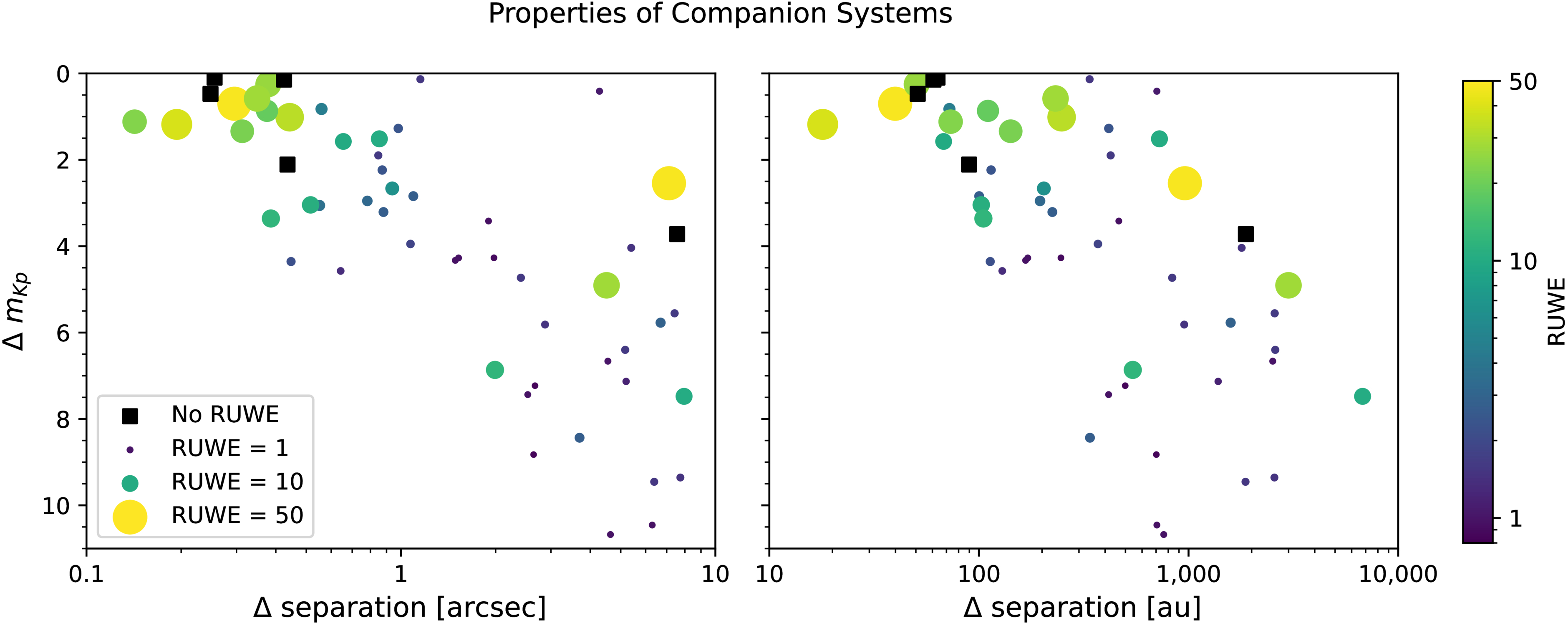 Imaged companions in our Kepler control sample, showing magnitude differences in the Kepler band as functions of projected (left) on-sky or (right) physical separations (measured with respect to the primary). Circle markers are colored and sized by the RUWE values of the primary star; black square markers indicate systems that did not have RUWE values available in Gaia DR3. The cutoff for on-sky separations to be included in our sample was roughly twice the Kepler pixel size (∼8″).