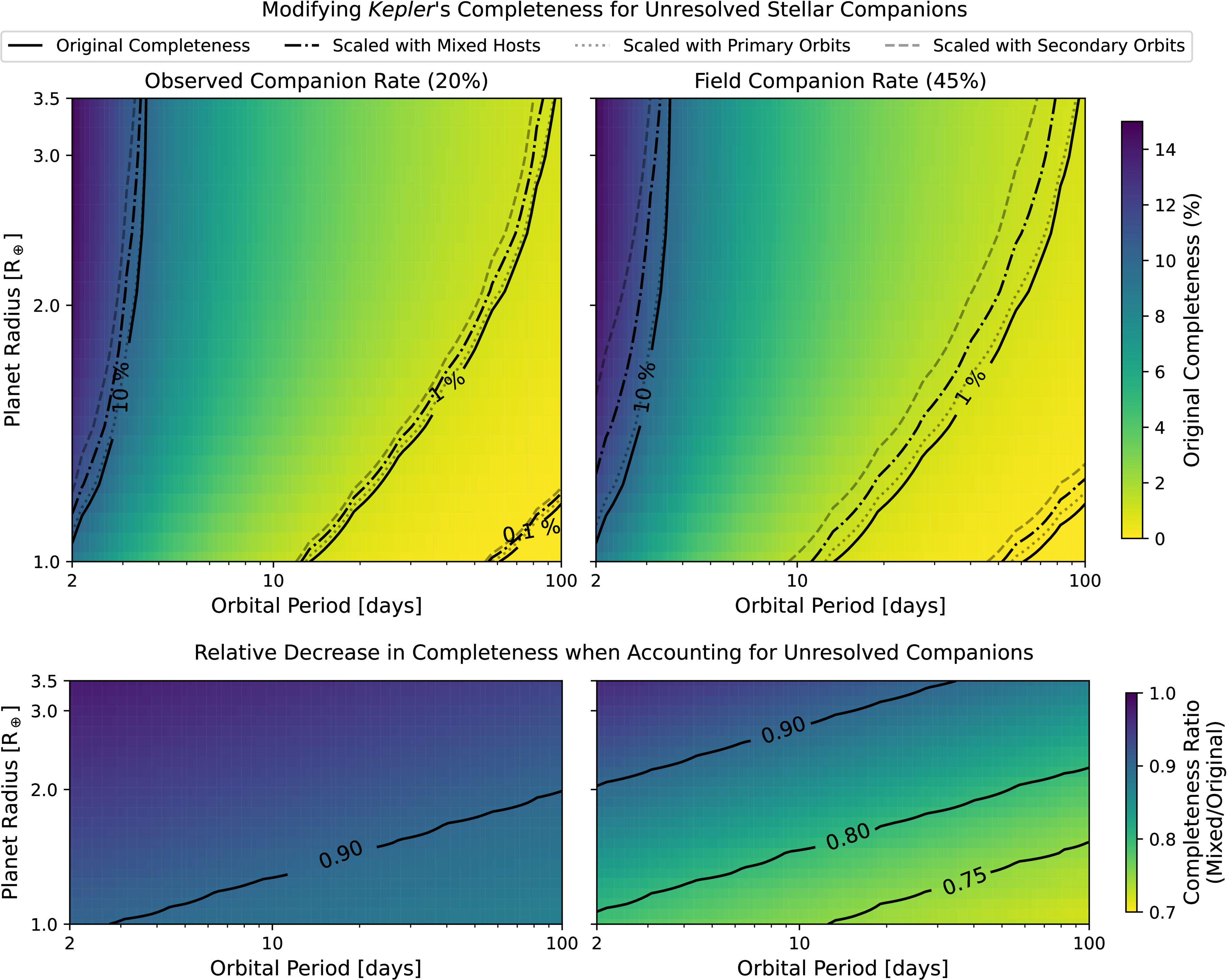 Modifications to the Kepler survey completeness for our sample, based on the simulated presence of stellar companions using (left) the properties of our observed companion sample at their observed rate of 20%, or (right) a combination of properties from our observed and simulated undetected companions at the field rate of 45%. Top: the color map denotes the original (i.e., Scenario 1) Kepler average survey completeness, with black solid contours at the 0.1%, 1%, and 10% levels. Other contours represent the average completeness maps from scenarios where some stars are assigned companions, shifting their completeness grids vertically upwards. These shifts depend on radius correction factors drawn assuming planets orbit the primary (dotted; Scenario 2), secondary (dashed; Scenario 3), or a mix of the two (dotted–dashed; Scenario 4). Bottom: the color map denotes the ratio of average completeness maps with vs. without companions (Scenarios 4 and 1, respectively). Contours show where the Scenario 4 map equals either 75%, 80%, or 90% of the original Scenario 1 map.