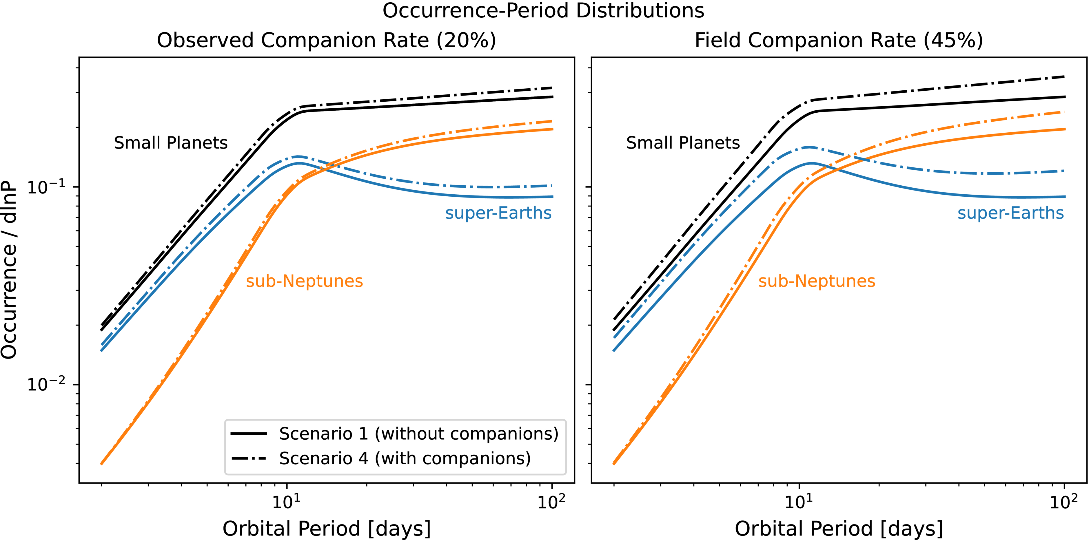 The median occurrence–period distributions from our models with (Scenario 4; dotted–dashed lines) and without (Scenario 1; solid lines) a treatment for unresolved stellar companions, using either (left) the observed companion rate and properties, or (right) the field companion rate and blend of observed/simulated undetected properties. Colors denote the marginalized distributions for either super-Earths (blue; 1–2 R⊕), sub-Neptunes (orange; 2–3.5 R⊕), or their combination for all small planets (black; 1–3.5 R⊕).