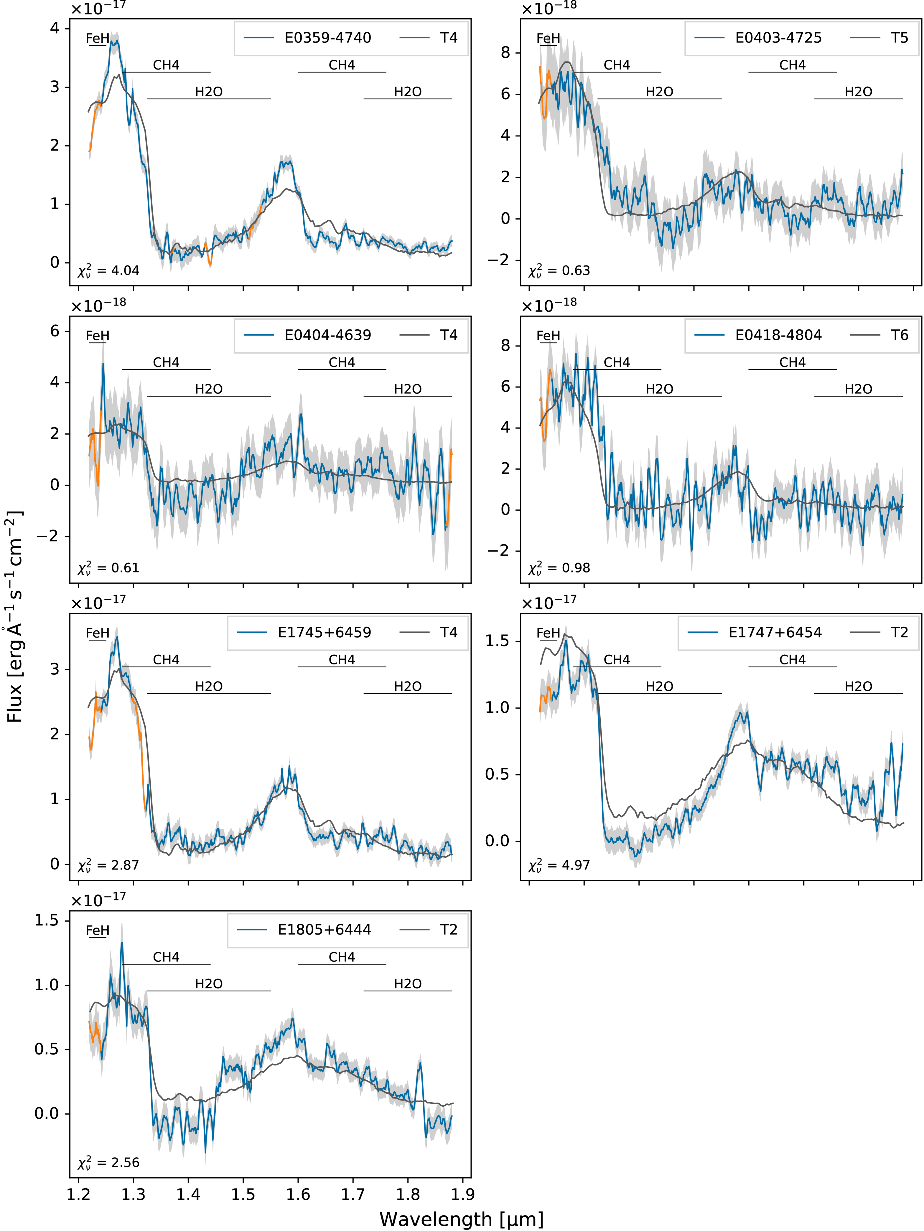 Comparison of smoothed candidate spectra (blue curves) with the Burgasser templates (dark gray curves) for the 15 selected candidates. The orange curves represent flagged values (e.g., due to low quality or artifacts). The shaded gray area around each spectrum represents the flux uncertainty. Key molecular absorption features are indicated by horizontal black lines (FeH, CH4, and H2O). Specifically, CH4 bands span 1.28–1.44 μm in the J band and 1.6–1.76 μm in the H band; H2O bands span 1.325–1.55 μm in the J band and 1.72–2.14 μm in the H band. While several spectra exhibit clear methane absorption features characteristic of mid-to-late T dwarfs (e.g., at 1.3 and 1.6 μm), others show considerable noise or deviations from the templates, reflecting the limitations of low-resolution slitless spectroscopy and varying data quality in the Euclid Q1 release. The reduced chi-squared fit statistic, displayed in the bottom-left corner, provides a quantitative measure of the fit quality.