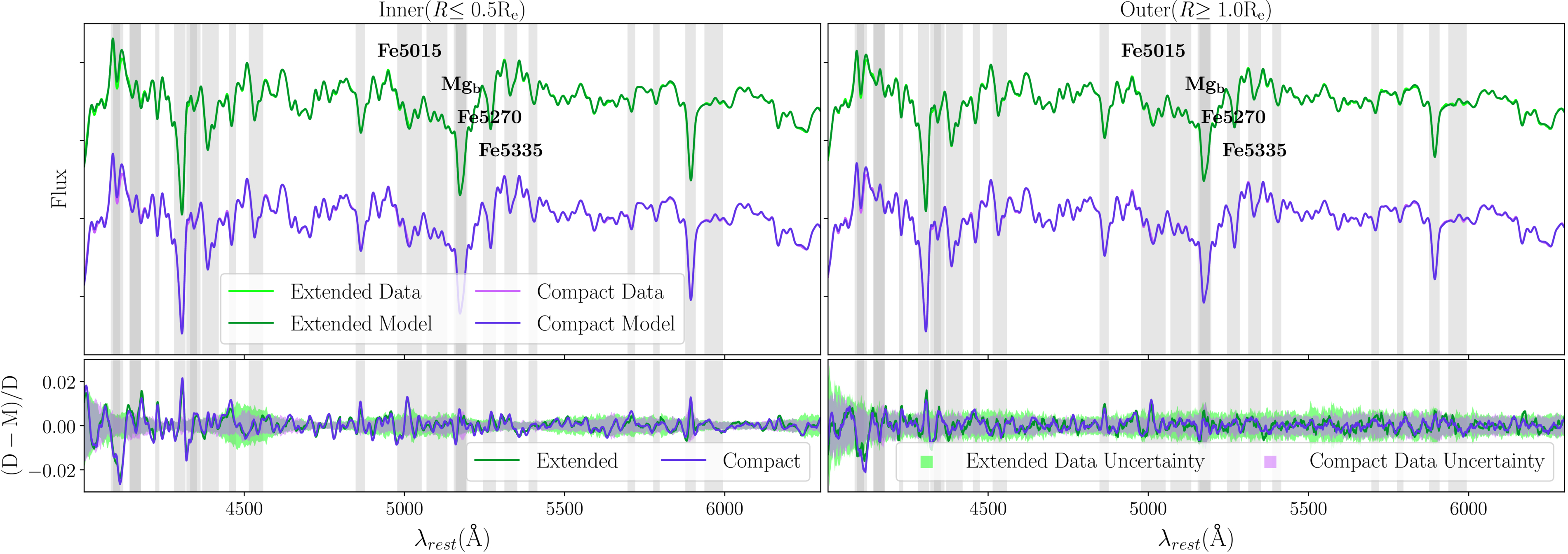 Top row: continuum-extracted input data (lighter-colored lines) and the model spectra (darker-colored lines). Bottom row: relative residual = (data – model)/data and relative data uncertainty (3σ/data) shown in lines and shaded areas, respectively. The inner and outer spectra are shown in the left and right subplots, respectively. The extended subsample is in green, and the compact subsample is in purple. The Jupyter notebook for reproducing this figure can be found here: ✎. This repository is also available on Zenodo (https://doi.org/10.5281/zenodo.17979404).