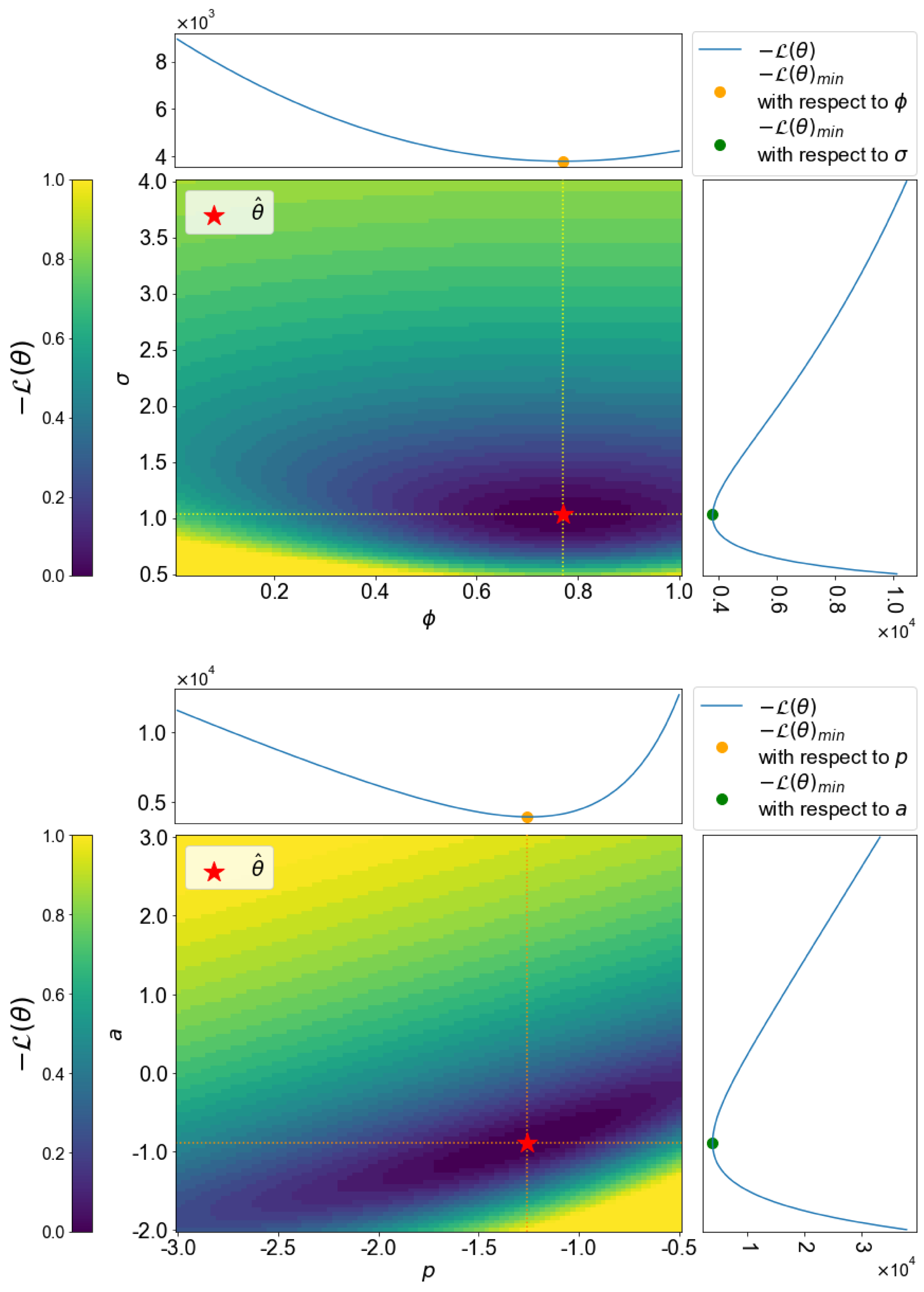 Top panel: a 2D color plot of the Whittle NLL function ﹩-{ \mathcal L }(\theta )﹩ against AR(1) model parameters for the GLS periodogram of the X. Dumusque et al. (2012) α Cen B ﹩\mathrm{log}R{{\prime} }_{HK}﹩ time series. The x-axis and y-axis of the colored plot represent ϕ and σw, respectively. Bottom panel: ﹩-{ \mathcal L }(\theta )﹩ for power law models of the same time series. Here the x-axis and y-axis represent normalization a and exponent p, respectively. The color bars are normalized between 0 and 1 for visualization purposes. The blue curves show the marginalization of ﹩-{ \mathcal L }(\theta )﹩ with respect to a single parameter. The minimum values of ﹩-{ \mathcal L }(\hat{\theta })﹩ are marked with red stars.