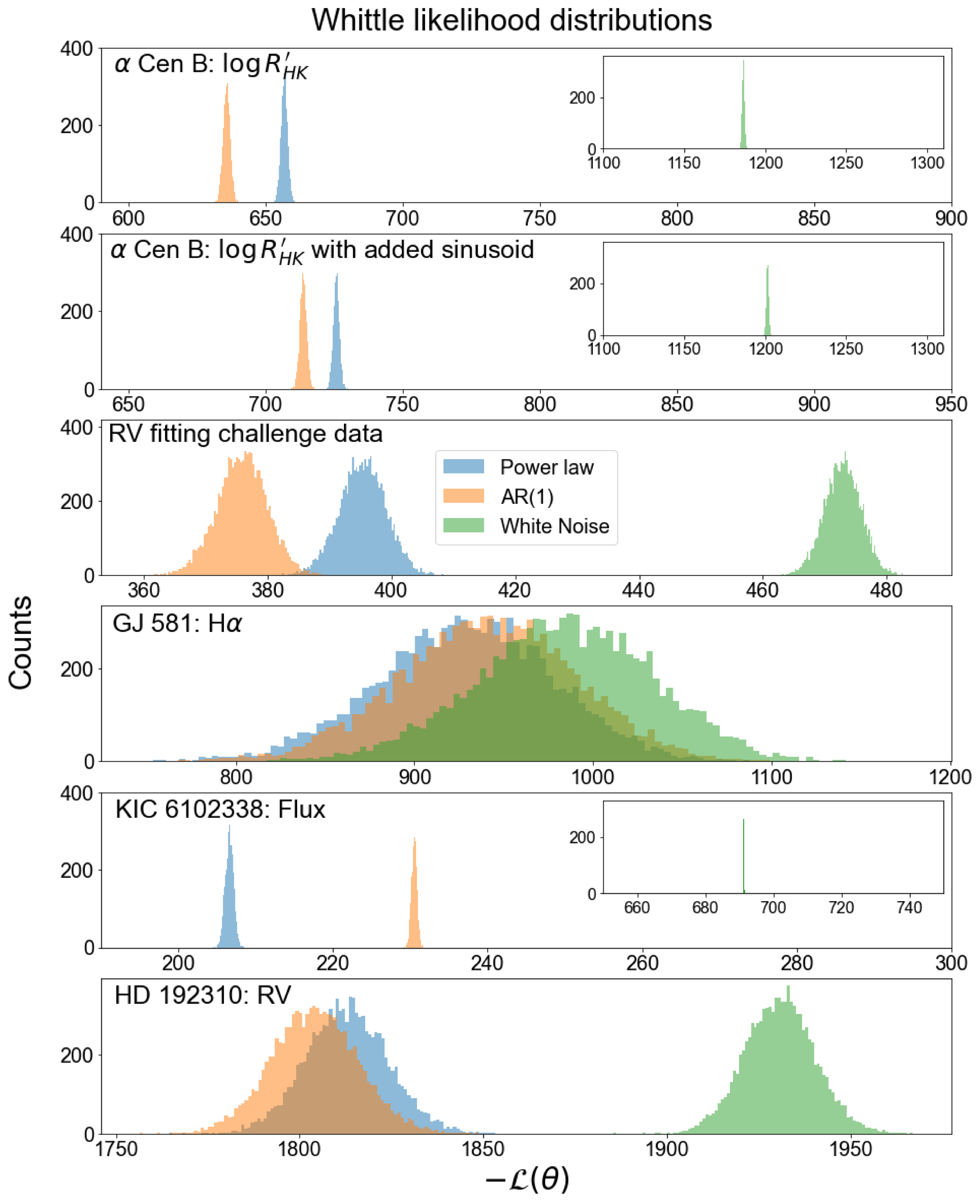 The Whittle NLL distributions created by fitting all three noise models to GLS periodograms of 10,000 realizations of each time series studied in this paper. ﹩-{ \mathcal L }(\theta )﹩ distributions from the AR(1) model are colored orange, ﹩-{ \mathcal L }(\theta )﹩ distributions from the power law model are in blue, and ﹩-{ \mathcal L }(\theta )﹩ distributions from the white noise fits are in green. From top to bottom, the time series are α Cen B ﹩\mathrm{log}R{{\prime} }_{\mathrm{HK}}﹩ (X. Dumusque et al. 2012), simulated RVs from System 11 of the RV fitting challenge (X. Dumusque 2016a), GJ 581 Hα (P. Robertson et al. 2014), Kepler photometry of KIC 6102338 (W. J. Borucki et al. 2010), and HD 192310 RVs (K. Laliotis et al. 2023).