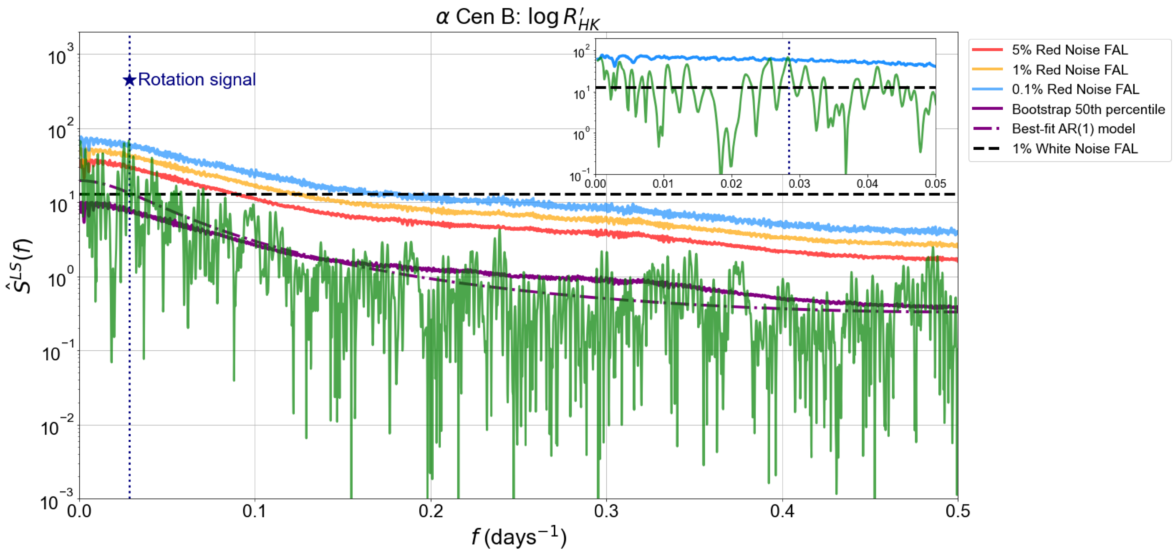 AR(1)-based FALs for the GLS periodogram of the α Cen B ﹩\mathrm{log}{R}_{\mathrm{HK}}^{{\prime} }﹩ time series (X. Dumusque et al. 2012) The 5% (red line), 1% (orange), and 0.1% (blue) red noise FALs follow the shape of the red noise continuum. The 1% white noise FAP estimated by the bootstrap method is plotted for comparison (black dashed line). The best-fit AR(1) model (purple dashed–dotted line) and the 50% percentile (purple line) of the Monte Carlo realizations are also shown. The rotation signal (navy dotted line) reaches the 0.1% FAL or 99.9% significance threshold. The figure inset at the top right shows a zoomed-in version of the plot centered on the rotation signal (navy dotted line), which reaches the 0.1% FAL.