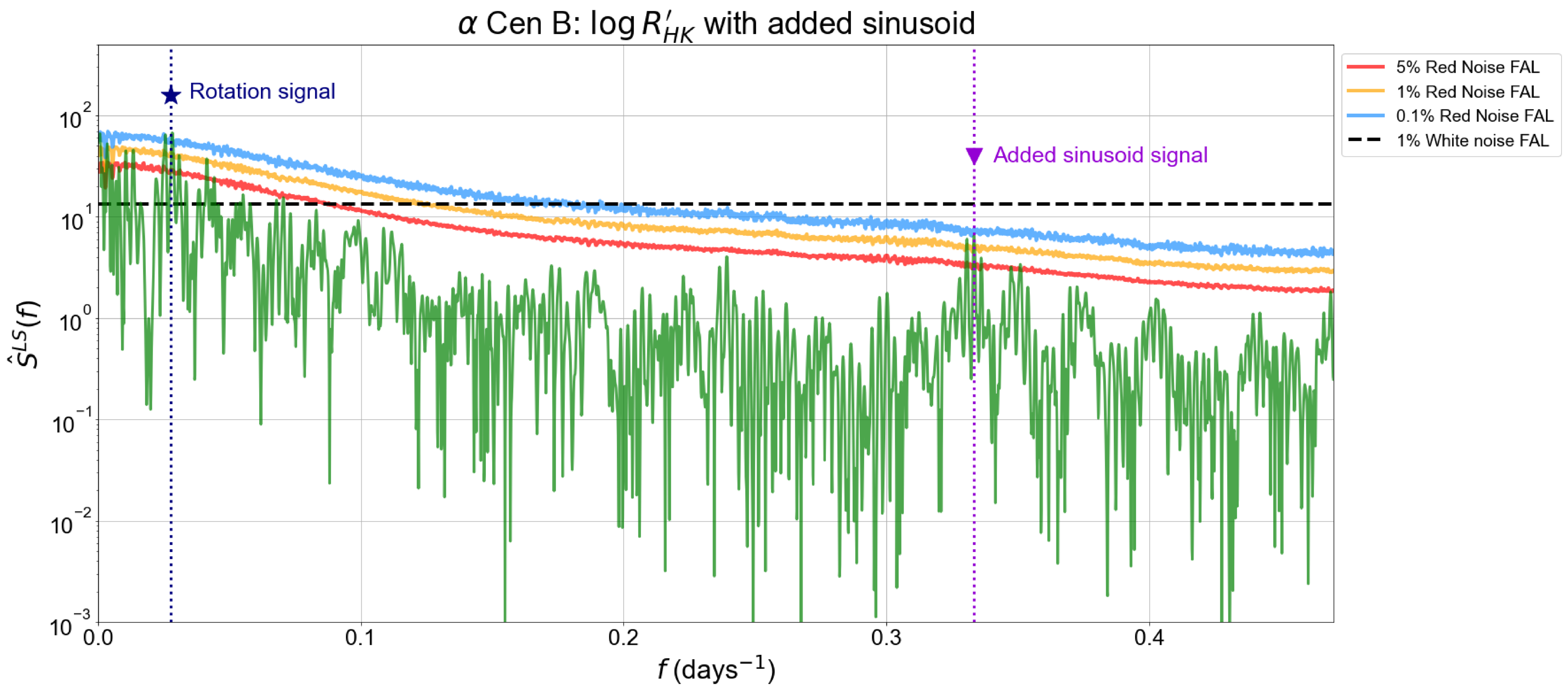 The GLS periodogram of the new time series ﹩{x}_{n}^{{\prime} }﹩ generated by adding a periodic signal to the α Cen B ﹩\mathrm{log}{R}_{\mathrm{HK}}^{{\prime} }﹩ data (X. Dumusque et al. 2012) according to Equation 12. The navy dotted line represents the rotation signal, and the light purple dotted line shows the added sinusoid. The added signal exceeds the 1% FAL/99% significance level from the AR(1) model (blue solid line), but misses the white noise–based 1% FAL (black dashed line).