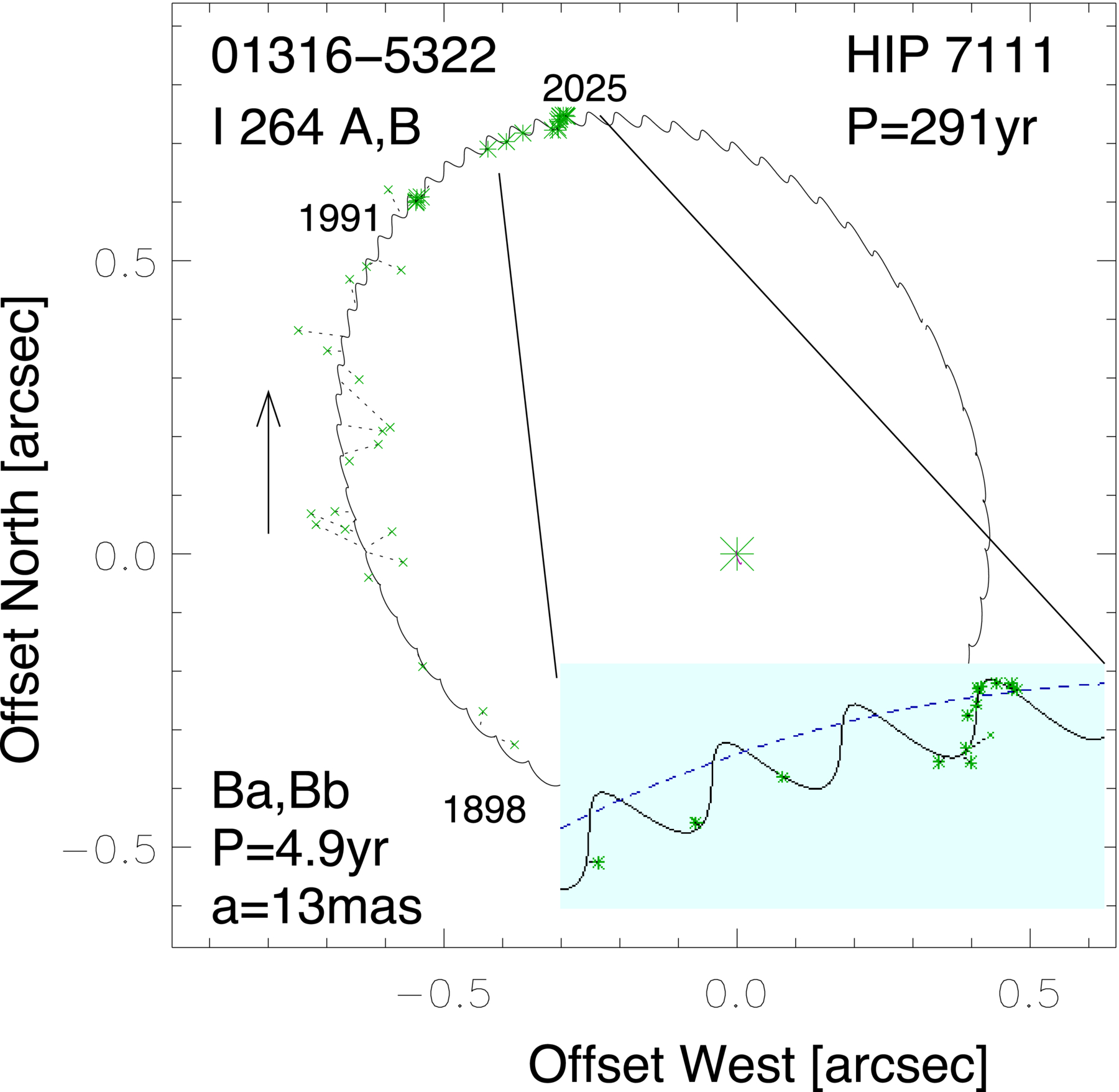 Orbits of HIP 7111. The outer trajectory with wobble (full line), SOAR observations (asterisks), and the center-of-mass trajectory (dashed line) is plotted, with a zoomed fragment in the insert. Less accurate measurements are plotted as crosses.