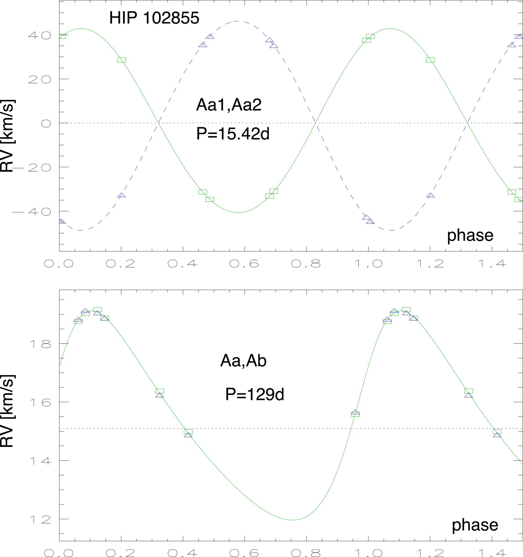 Spectroscopic orbits of HIP 102855 Aa1, Aa2 (top) and Aa, Ab (bottom). In each plot, the contribution of the other orbit is subtracted.