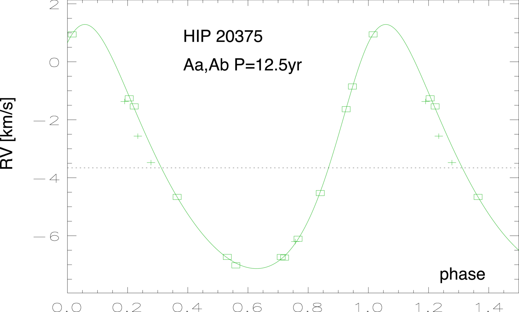 Spectroscopic orbit of HIP 20375. Three crosses denote RVs computed from the Gaia quadratic trend.