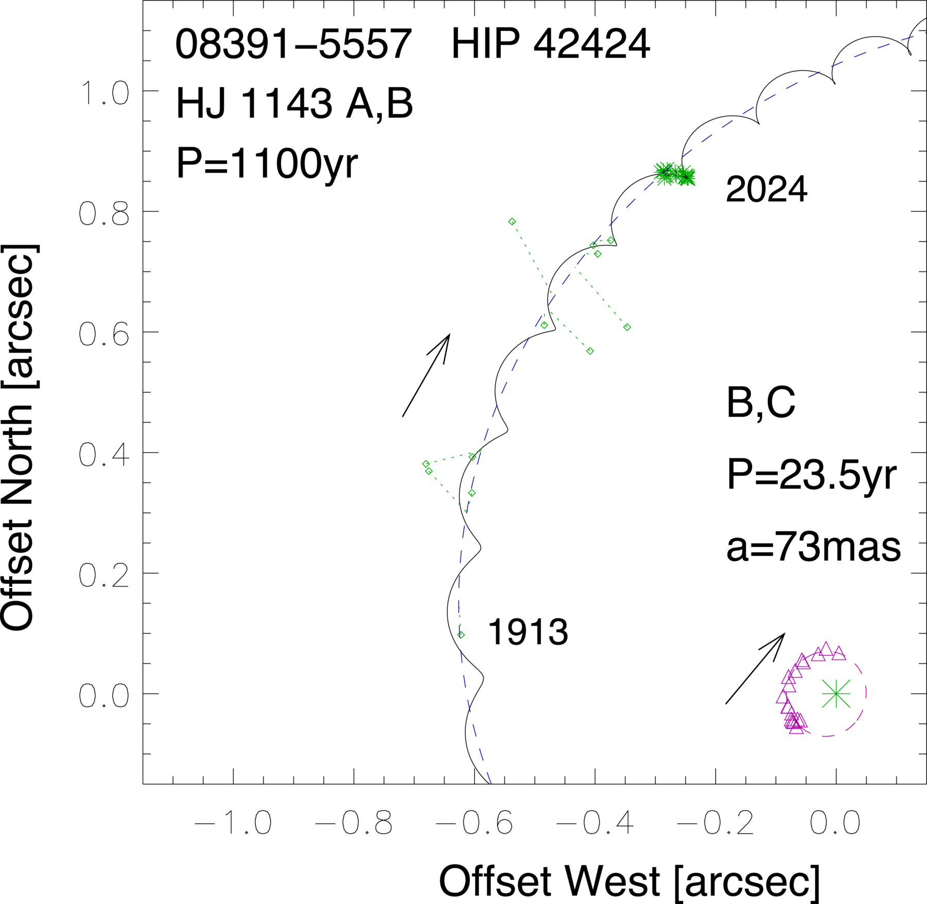 Orbits of HIP 42424. Magenta triangles and the inner ellipse show the orbit of B,C.