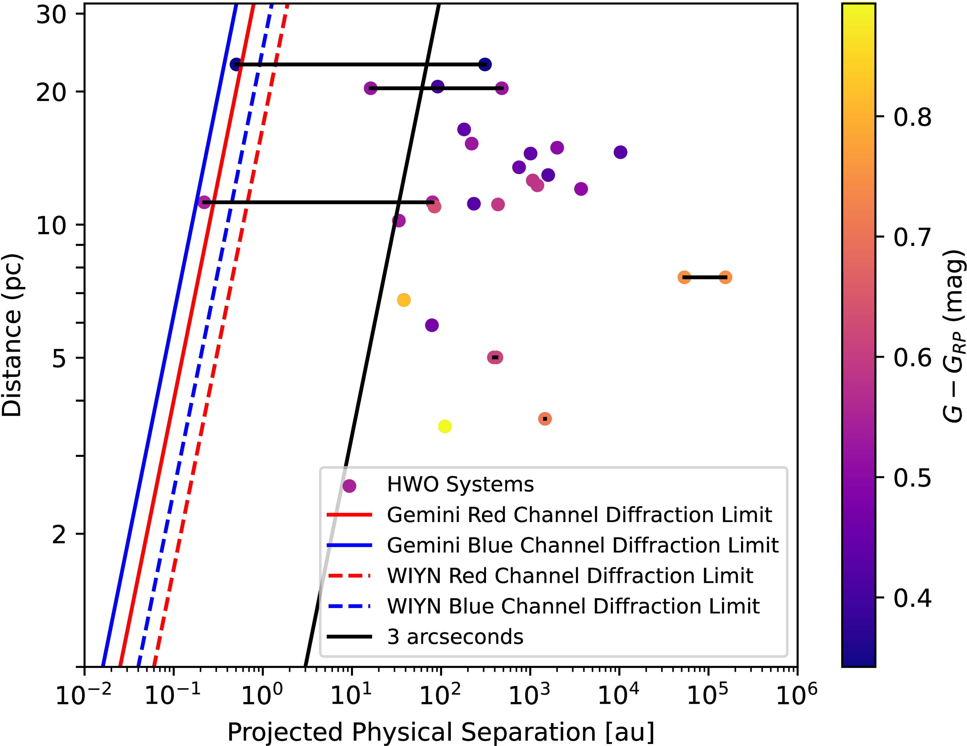 Distances to the 27 multistar systems identified in this study as a function of projected physical separation. The solid red and blue lines represent the nominal diffraction limits for the 562 nm (blue) and 832 nm (red) filters installed in ‘Alopeke and Zorro. The dashed lines represent the same for NESSI. The black line is the 3″ cut used in the original sample selection for the ExEP provisional star list for HWO. The color of the points highlights the G − GRP values of the stars. If the system is triple, then it has two points representing the AB and AC components, and we connect these systems by the black horizontal lines. We assume the primary’s distance as the distance for the system. The majority of the stellar companions lie beyond 3″, which shows that the selection criteria from E. Mamajek & K. Stapelfeldt (2024) removed most close-in multiples from the sample. However, some systems are still found with separations less than 3″, which highlights the need for a uniform multiplicity study of all the potential HWO target stars.