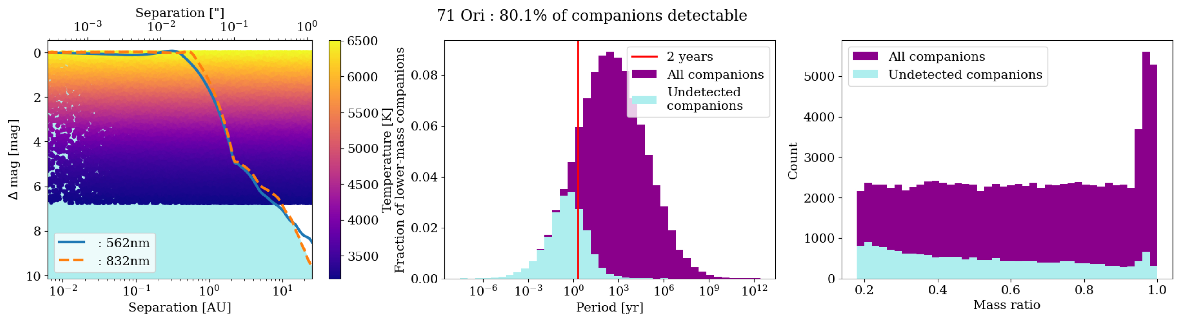 Results of the Missing Companions Analysis for 71 Ori. Left: simulated stellar companions as a function of magnitude difference and separation. The color of the points indicates the effective temperatures of the simulated companions. The solid and dashed red lines show the contrast curves from our speckle observations. Above these lines, we would expect to detect the companion. The region of Δm versus separation space that is shaded cyan represents the area where companions could reside and would not be detected by our speckle observations. The plot extends out to 1﹩\mathop{.}\limits^{\unicode{x02033}}﹩17 as beyond this, the correlation between the speckles breaks down, and we lose detection sensitivity. For 71 Ori, this corresponds to a separation of 25.48 au. Middle: Period distributions of the simulated companions. The magenta histogram is the distribution of all 100,000 simulated companions, while the light blue histogram highlights what would not be detectable in our speckle observations. Right: similar to the middle panel, but for mass ratio. We find that 80.1% of the simulated companions to this target are detected.