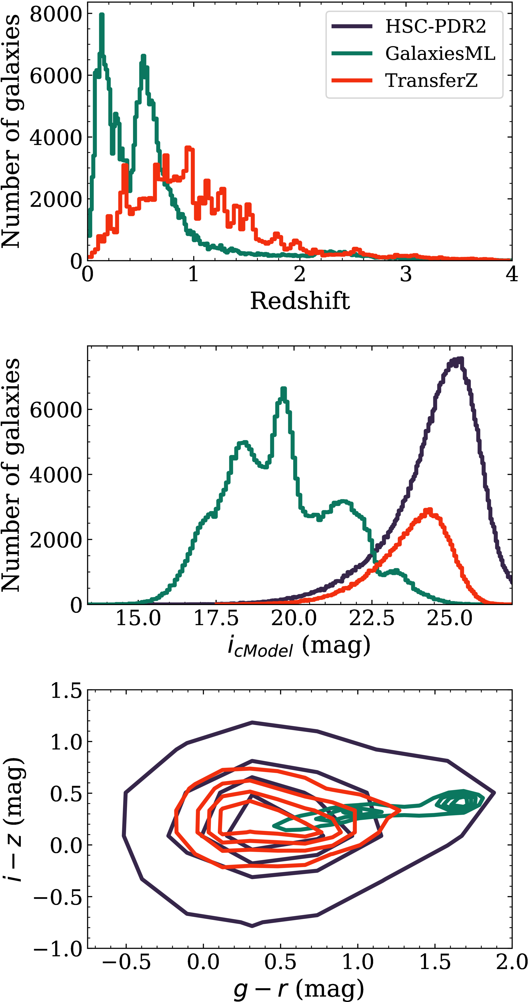 Three datasets: a sample of 500,000 galaxies from HSC-PDR2 (H. Aihara et al. 2019), GalaxiesML (T. Do et al. 2024) with spectroscopic redshift ground truth, and TransferZ (this work) with COSMOS2020 catalog (J. R. Weaver et al. 2022) multiband imaging redshift ground truth. The distributions of the dataset in redshift (top), i-band magnitude (middle), and color–color (bottom) show how the datasets complement each other to help the models generalize beyond the range of brightness and color sampled by a spectroscopic survey.