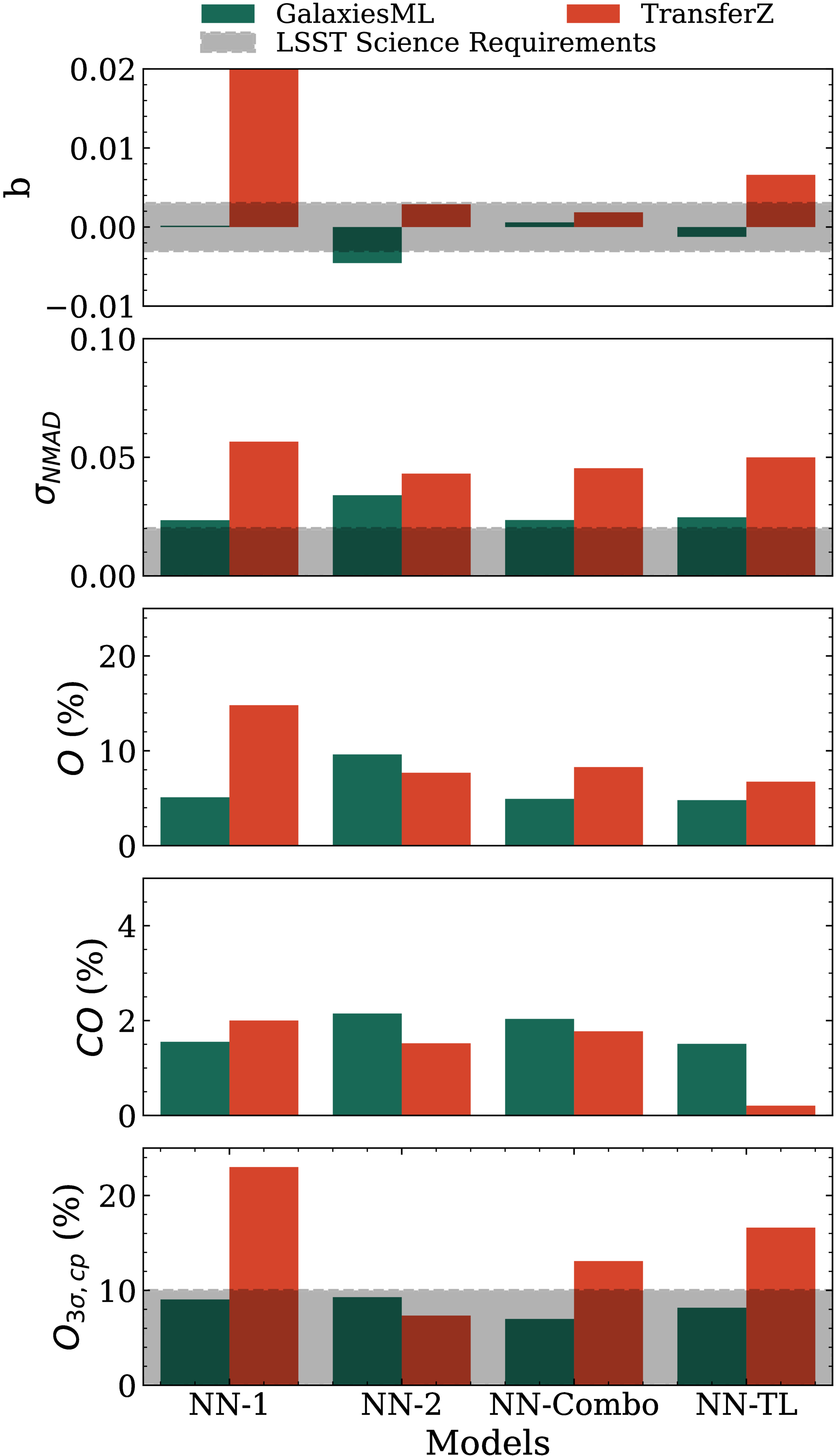 A comparison of the performance of NNs using metrics averaged over the redshift range 0.3 < z < 1.5 (see Section 3.3.1). The gray shaded area corresponds to the LSST science goals. The NN-TL and NN-Combo models show comparable performance on both GalaxiesML and TransferZ, with NN-Combo meeting one more requirement than NN-TL. NN-2 performs comparably to NN-TL and NN-Combo, but with a higher outlier rate O on GalaxiesML.