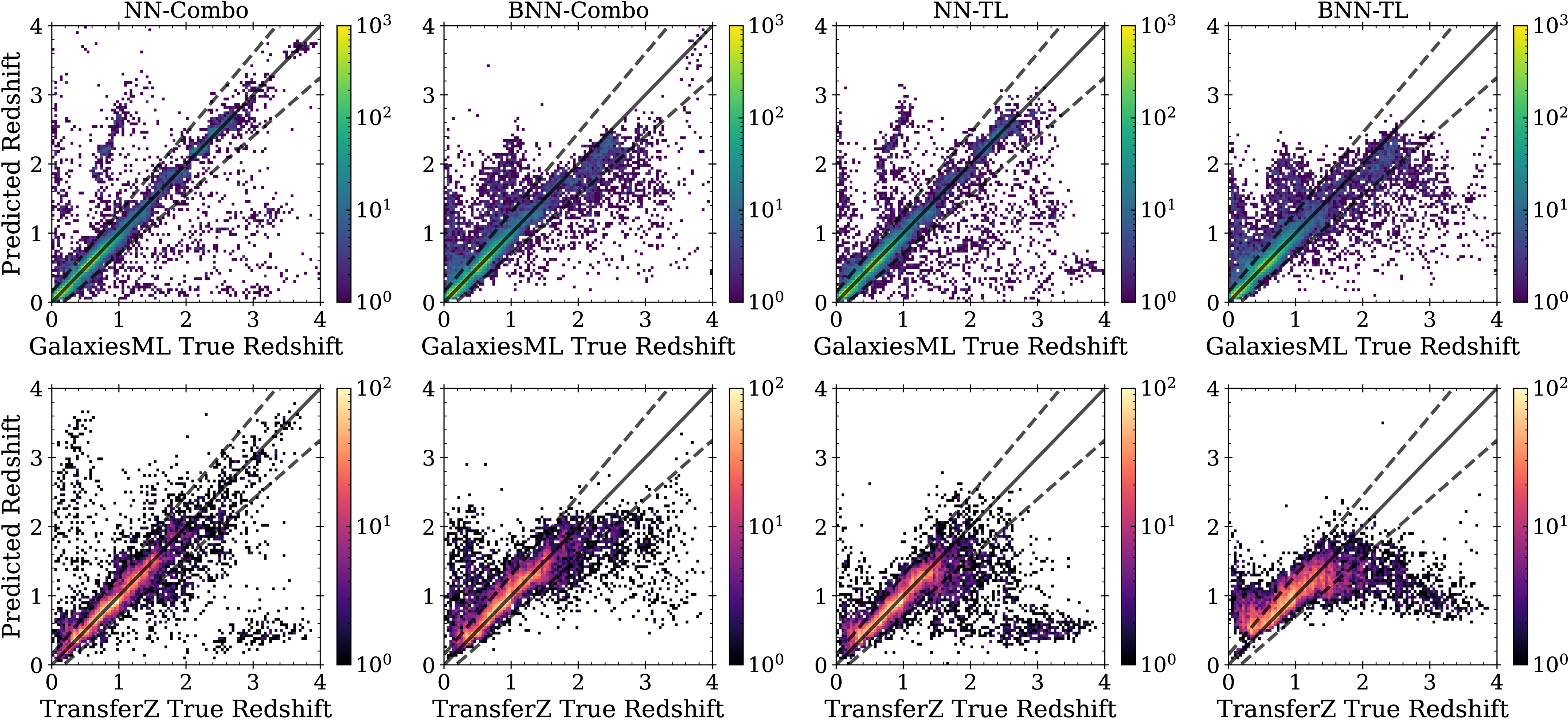 Photometric vs. ground-truth redshift for deterministic and probabilistic models trained on different approaches to mixing of GalaxiesML and TransferZ. The models are evaluated on a 28,000 sample of galaxies from GalaxiesML (top) and 11,000 sample of galaxies from TransferZ (bottom). The NN-Combo and BNN-Combo are models trained on a composite dataset approach while NN-TL and BNN-TL are trained on transfer learning from a base model trained on TransferZ and fine-tuned on GalaxiesML. The solid black line is a one-to-one line and the dashed black lines correspond to outliers with zpred > ± 0.15(1 + ztrue). The color scale indicates the density of data points (log scale). The deterministic models show less scatter and lower bias on both datasets than probabilistic models, with BNN-TL showing the most scatter.