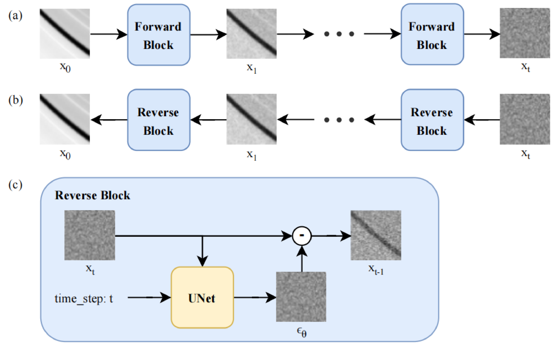 Illustration of the DDPM framework. (a) Forward process, (b) reverse process, (c) structure of the reverse block in the reverse process.
