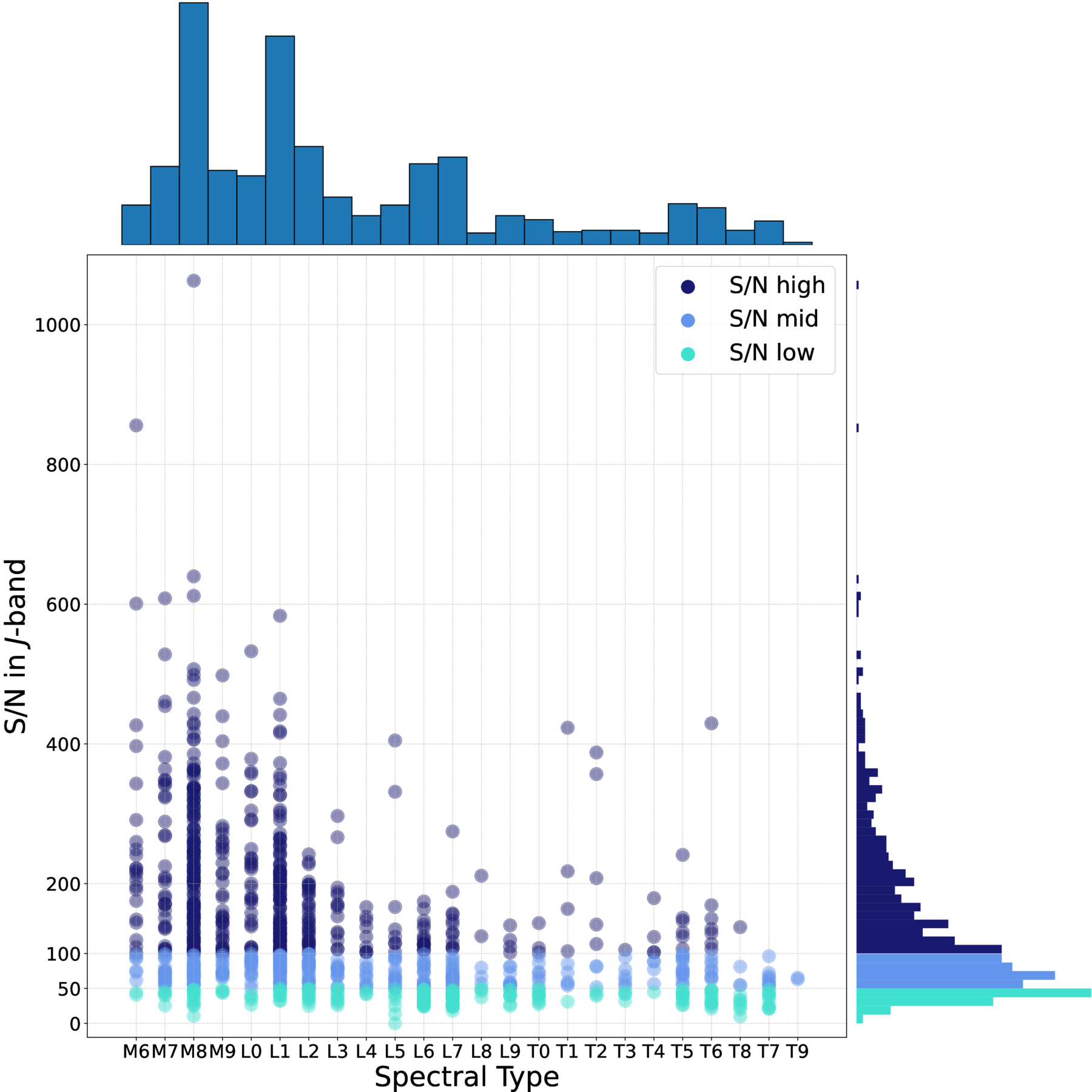 J-band S/N vs. spectral type of our empirical spectral sample. Each individual spectrum is plotted and color coded by its assignment to low- (S/N < 50, light blue), mid- (50 ≤ S/N < 100, medium blue), and high-S/N (S/N ≥ 100, dark blue) groups. We show the marginalized distributions of the spectral type along the top axis, and for S/N along the right axis.