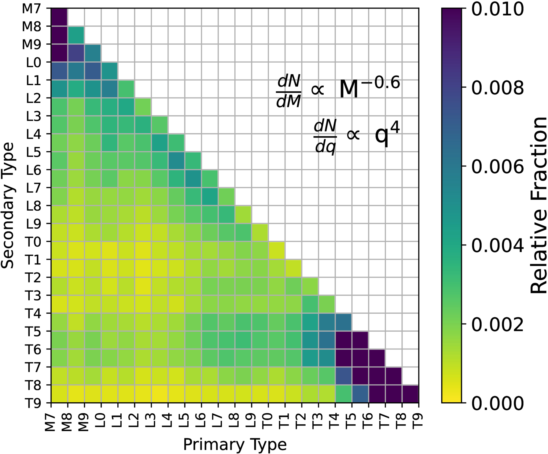 Component spectral type distributions for a simulated sample of VLM dwarf binaries assuming a uniform age distribution over 0.5–8 Gyr, a power-law mass distribution ﹩\frac{dN}{dM}\propto {M}^{-0.6}﹩ for 0.01 M⊙ ≤ M ≤ 0.1 M⊙, a power-law mass ratio distribution ﹩\frac{dN}{dq}\propto {q}^{4}﹩ for 0.2 ≤ q ≤ 1, I. Baraffe et al. (2003) evolutionary models, and the M. J. Pecaut & E. E. Mamajek (2013) spectral type/effective temperature relation. Color shading indicates the relative density distribution for each spectral type combination.