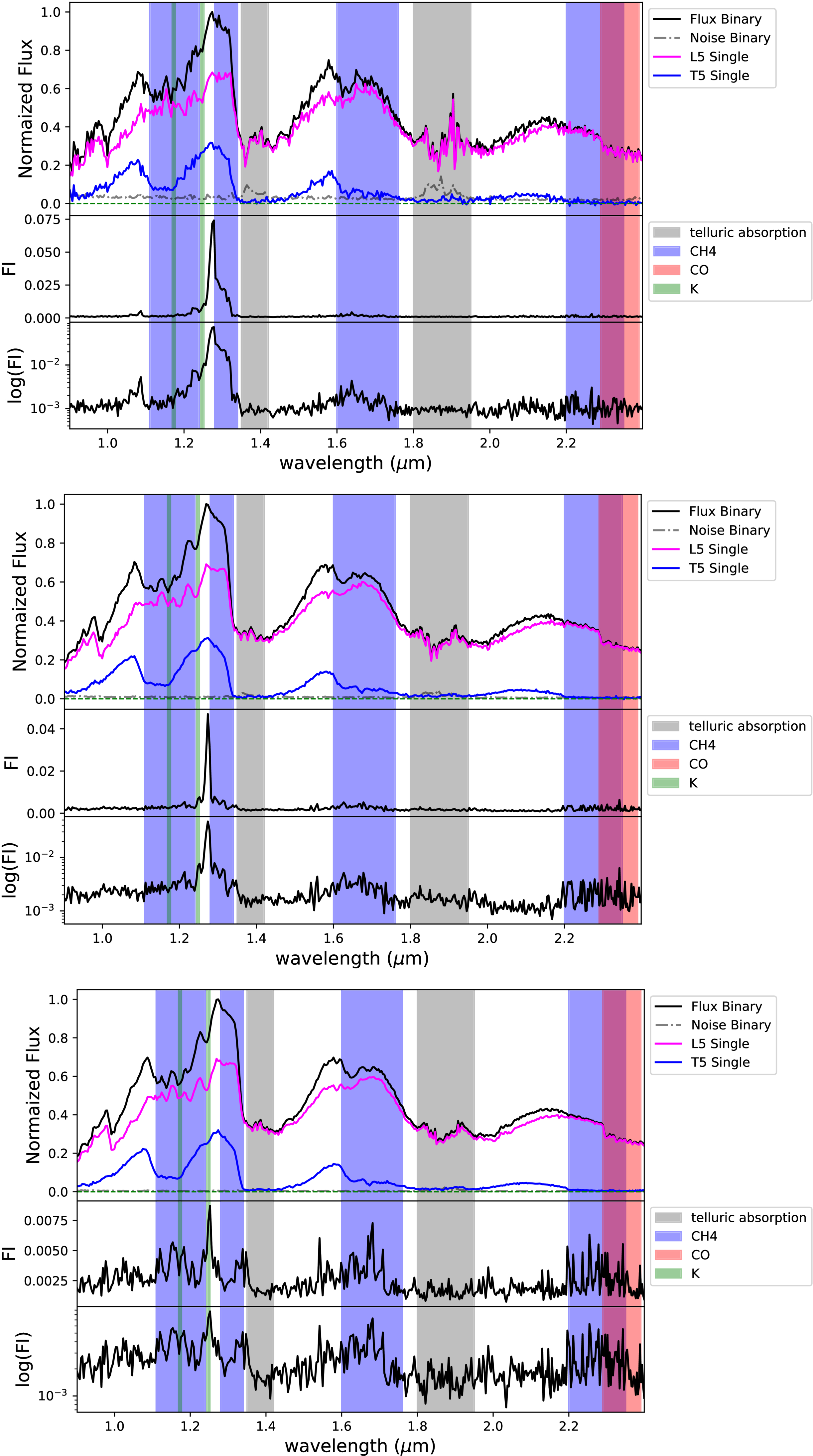 FI for the BId1 model for low- (top), mid- (middle), and high-S/N (bottom) groups. Each panel displays FI on linear (middle plot) and logarithmic scales (bottom plot), compared to an example of an L5 plus T5 binary spectrum with an S/N in the associated range (top plot). Regions associated with telluric (gray), K I (green), CH4 (blue), and CO (red) absorption are indicated by vertical bands.