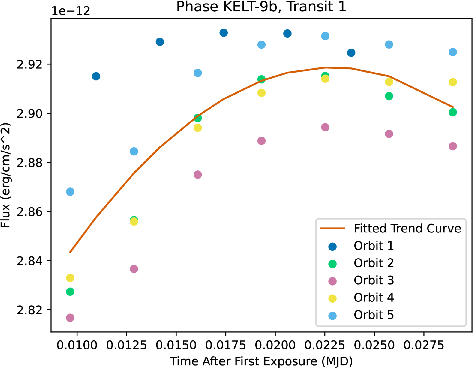 The initial second-degree systematics vector fitting for the first transit, with respect to HST’s orbital phase, is represented as the time since the first exposure in the orbit.