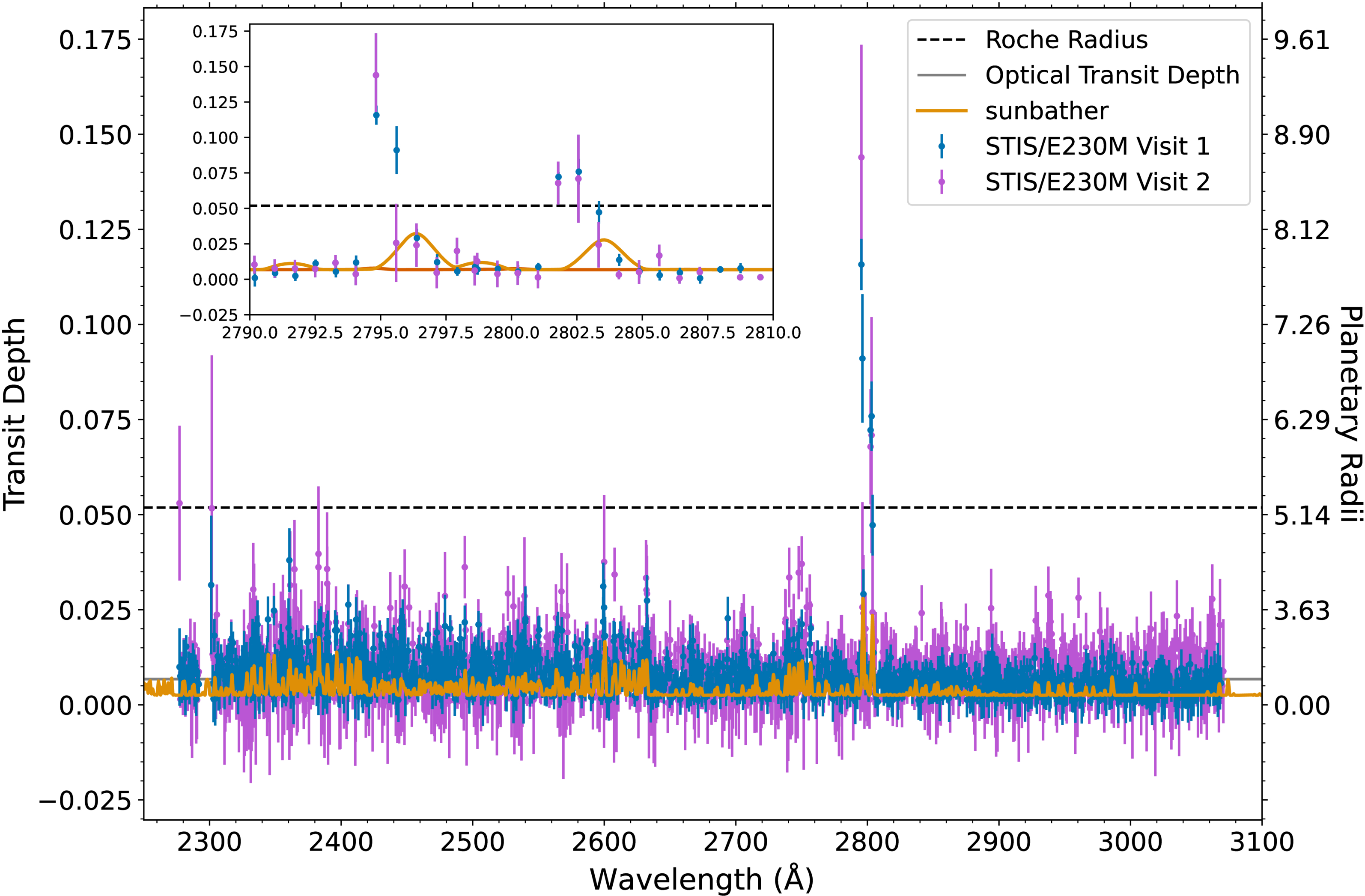 Best-fit sunbather model (gold, T = 13,200 K, ﹩\dot{M}\,=\,1{0}^{11.5}﹩ g s−1, Vbroad = 50 km s−1) to the combined two-visit dataset. The best-fit model to the entire spectrum does not match the magnitude or blueshift of the Mg II absorption near 2800 Å, shown in the inset plot, which extends beyond the Roche radius (black, dashed).