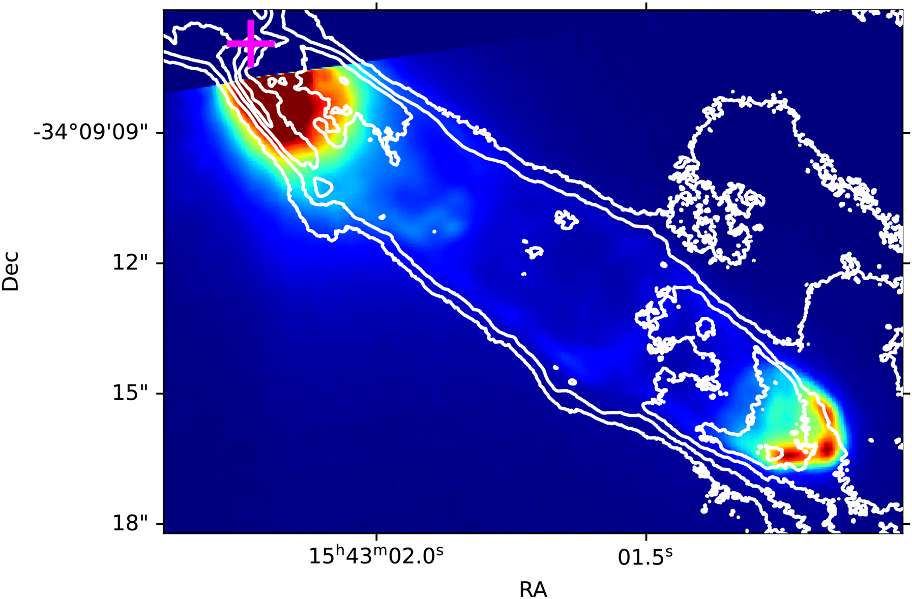 Integrated intensity map of 12CO of IRAS 15398 (contours) overlaid on a JWST MIRI image taken with the F1000W filter (color scale). The contours shown are 3σrms, 10σrms, 20σrms, 30σrms, and 40σrms, where σrms = 150 mJy beam−1 km s−1 is the rms noise of the image. The position of IRAS 15398 is indicated by the magenta cross. The south lobe is the same lobe shown in the channel map in Figure 2.