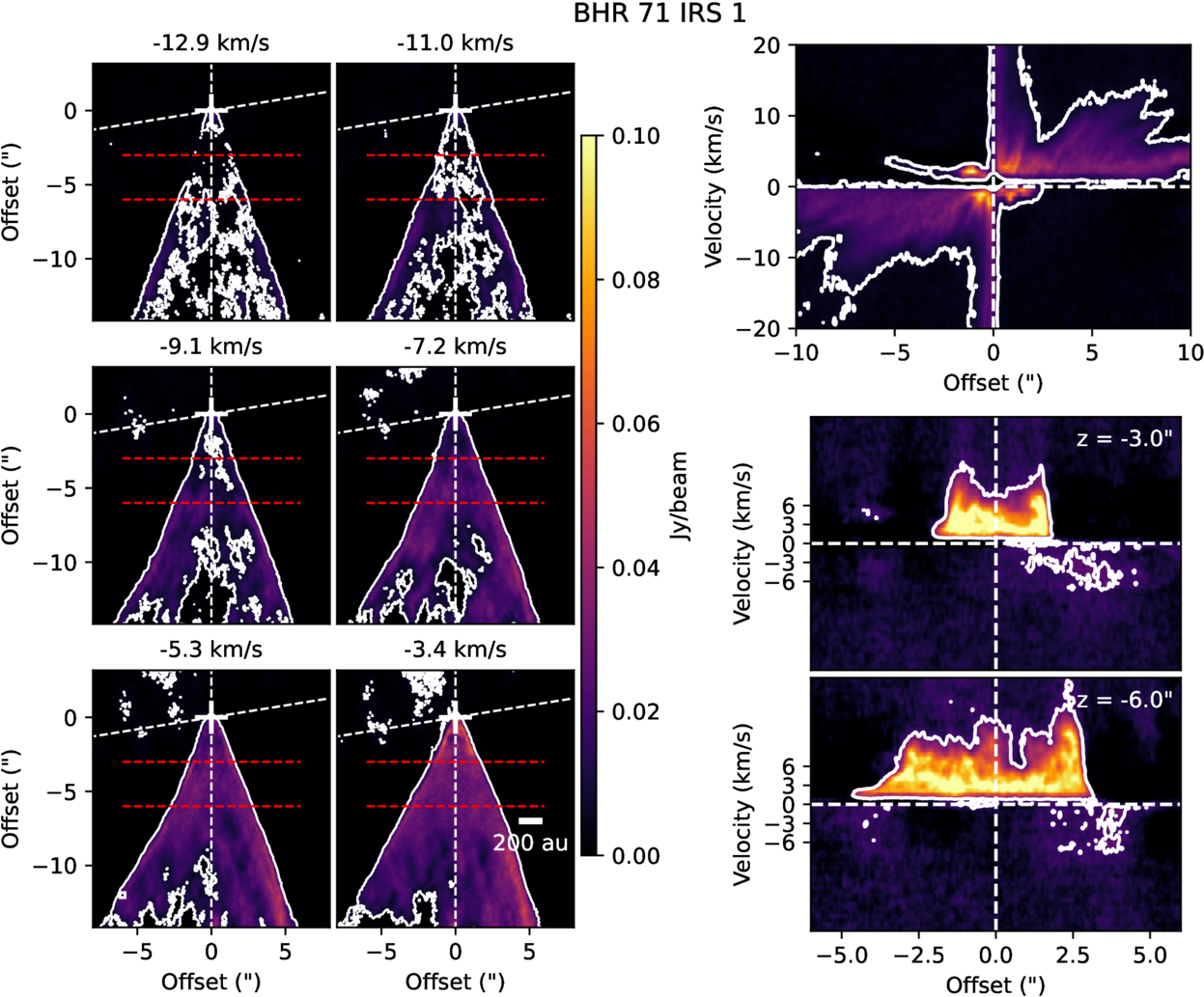 Similar to Figure 1 but for BHR 71 IRS 1. This is an example of an outflow showing slow disk wind emission, where the outflow axis is inclined to the plane of the sky. The bottom-right panel shows the P–V diagrams perpendicular to the outflow axis at 3″ (middle right) and 6″ (bottom right) from the protostar.