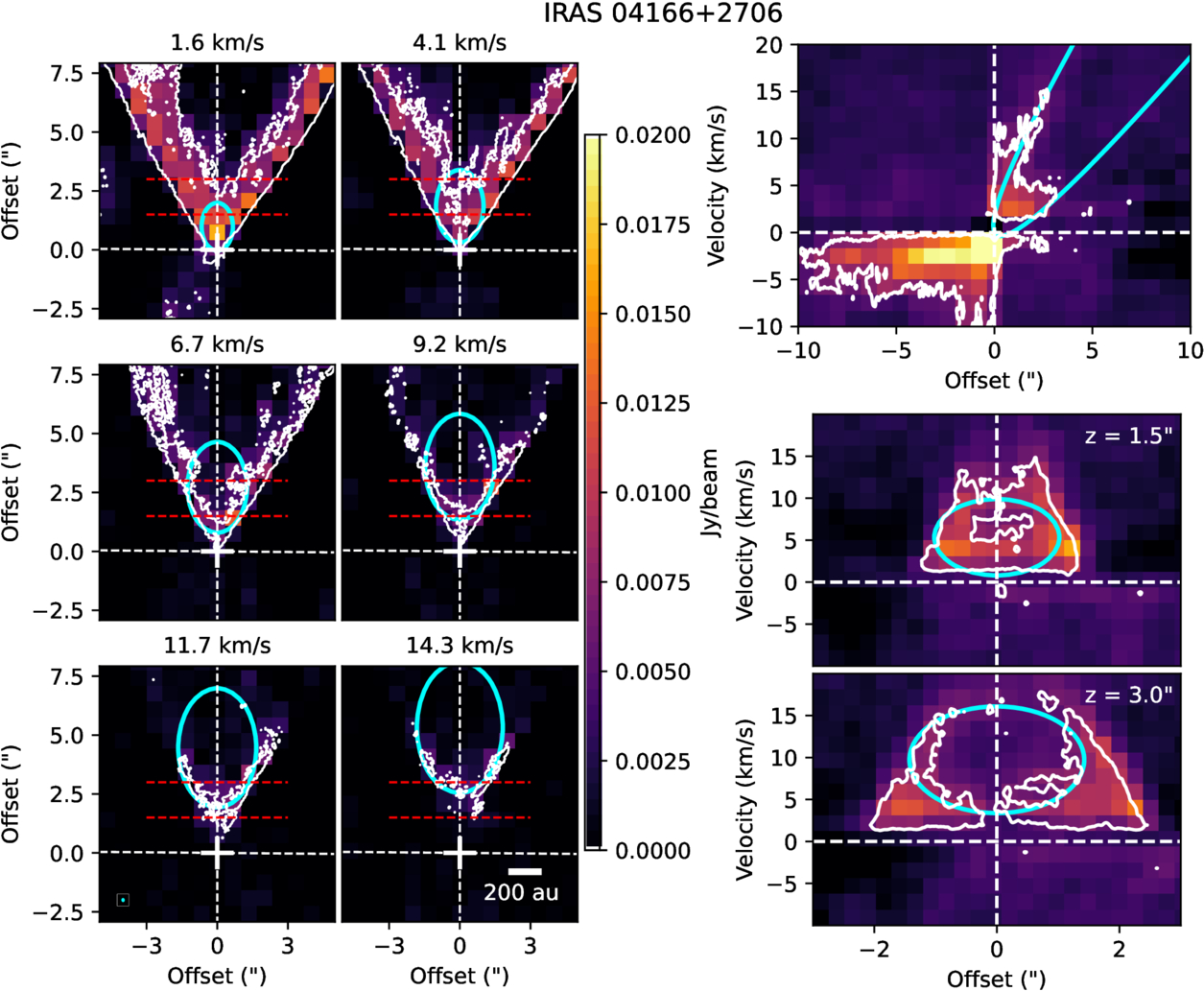 Similar to Figure 1 but for IRAS 04166. This is an example of an outflow showing a combination of slow disk wind and wind-driven shell emission. The bottom-right panel shows the P–V diagrams perpendicular to the outflow axis at 1﹩\mathop{.}\limits^{\unicode{x02033}}﹩5 (middle right) and 3″ (bottom right) from the protostar.