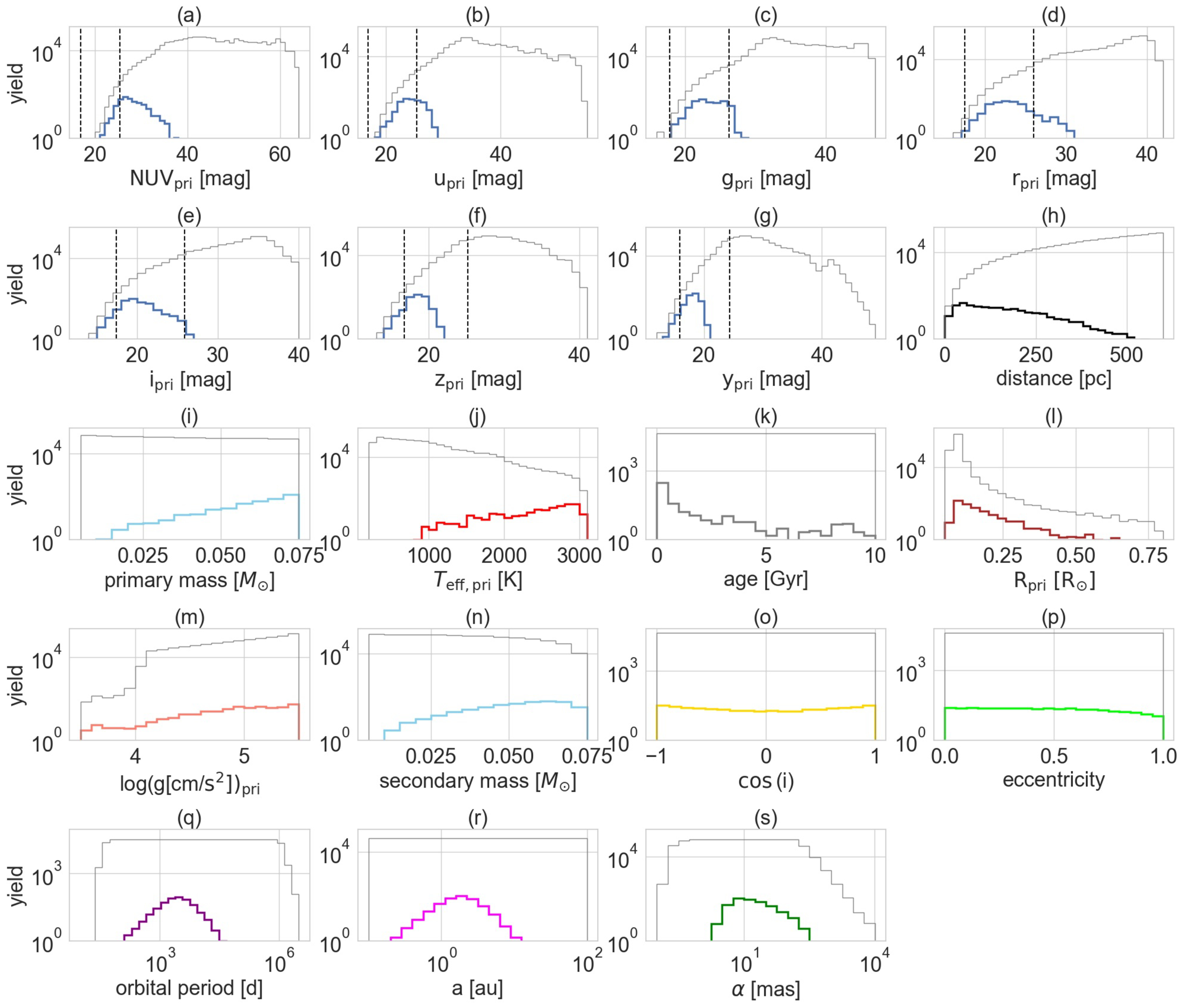 Distributions of the BD yield over parameters. The panels represent parameters as follows: primary magnitude in NUV, u, g, r, i, z, and y bands, distance, primary mass, effective temperature of primaries, system age, primary radius, log10 of the surface gravity for primaries, secondary mass, cosine of inclination, eccentricity, orbital period, semimajor axis, and angular semimajor axis. To compare with the companion yield, the gray lines in panels are plotted to show the property distributions of the brown dwarf sample or injected companions. The range between two dashed vertical lines is the magnitude range that the CSST-SC could observe.