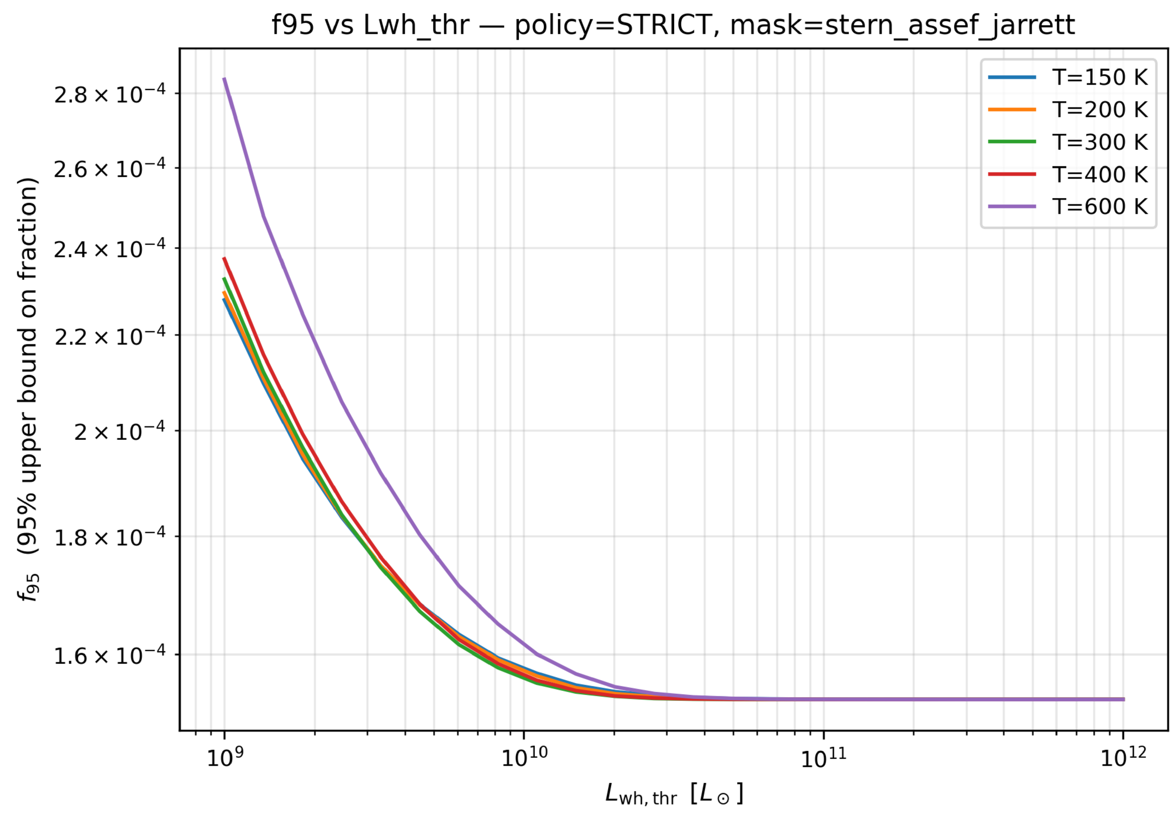 95% upper bounds on the fraction of galaxies, f 95, as a function of the waste heat luminosity threshold L wh,thr, for radiator temperatures T = {150, 200, 300, 400, 600} K. The analysis uses the STRICT sample (artifact–clean per band) with the combined Stern+Assef+Jarrett AGN/starburst masks applied. Upper limits are per object “flux caps” (W3/W4) with k = 3 (i.e., 3σ), and no stellar RJ subtraction unless otherwise noted. Curves are monotonic and converge where essentially all galaxies are sensitive; see Figure 4 for the corresponding denominators.