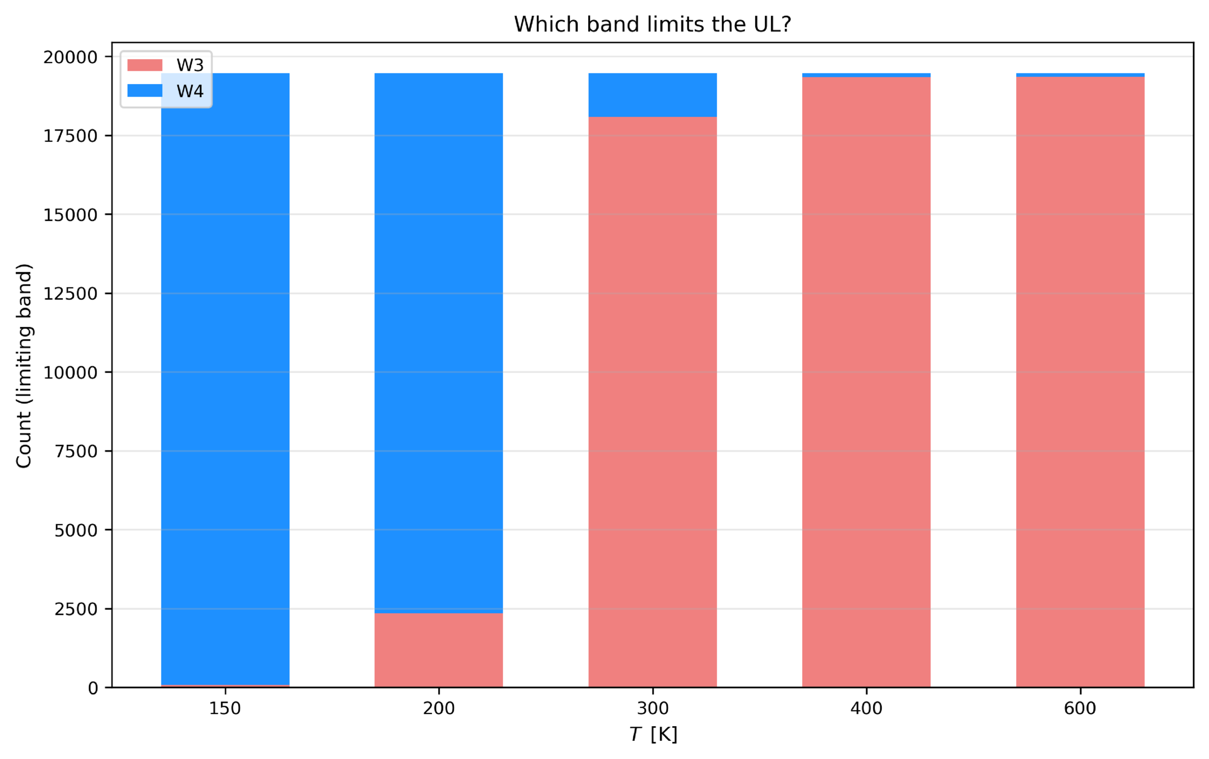 Which band sets the tightest per object upper limit as a function of radiator temperature T. At T ≲ 200 K, W4 (22 μm) overwhelmingly limits; at T ≳ 300 K, W3 (12 μm) dominates, consistent with Wien’s law and band sensitivities. These statistics explain the shapes of Figure 2 and guide future observing strategy.