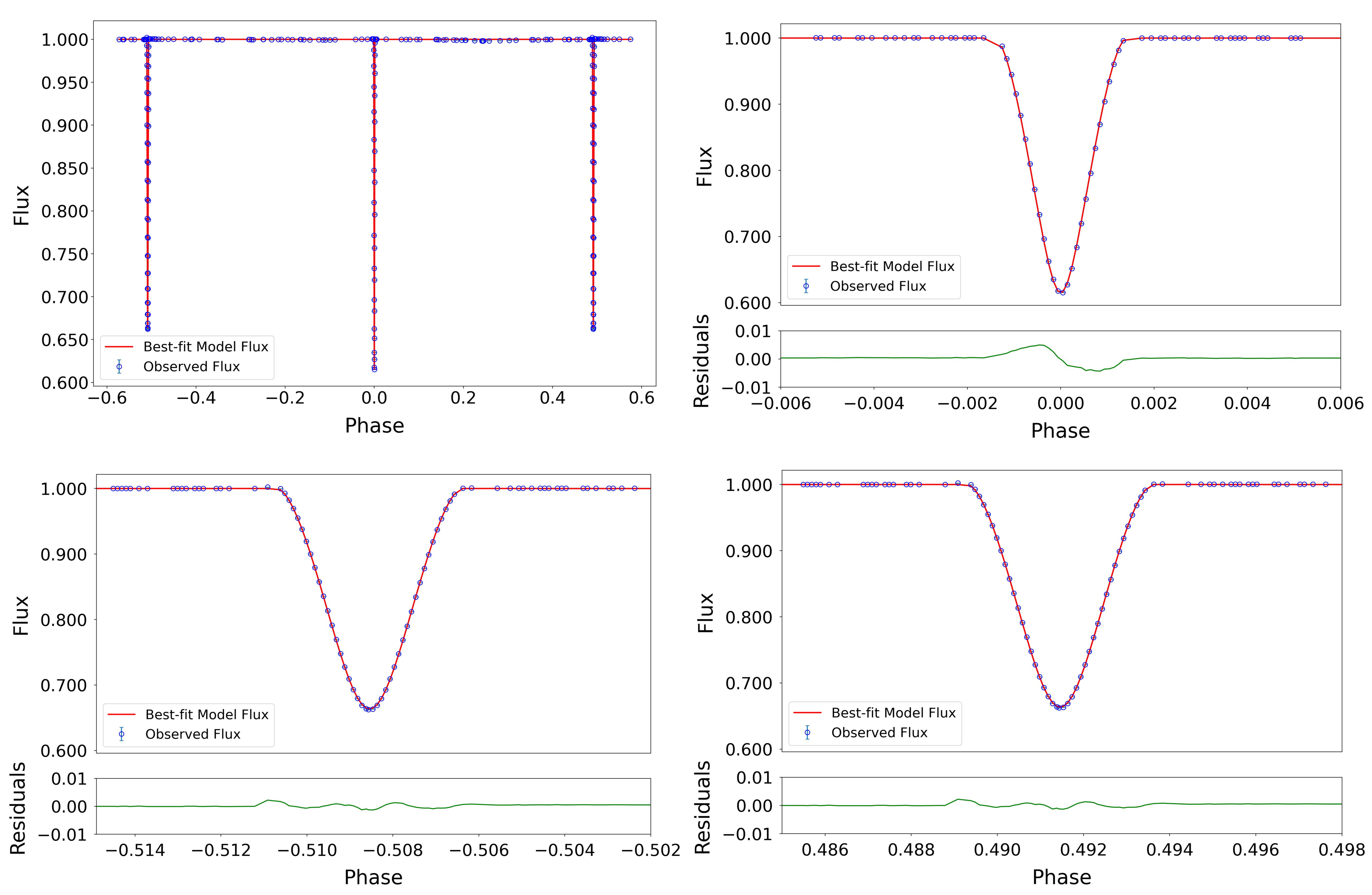 Comparison between the best-fit model (red line) and the photometric data during the second orbital cycle. The top-left panel shows the full light curve over phase −0.5–0.5, centered on the primary eclipse at phase 0.0. The remaining panels show zoomed-in views around the primary and secondary eclipses, with residuals (data − model) displayed below each corresponding light curve.