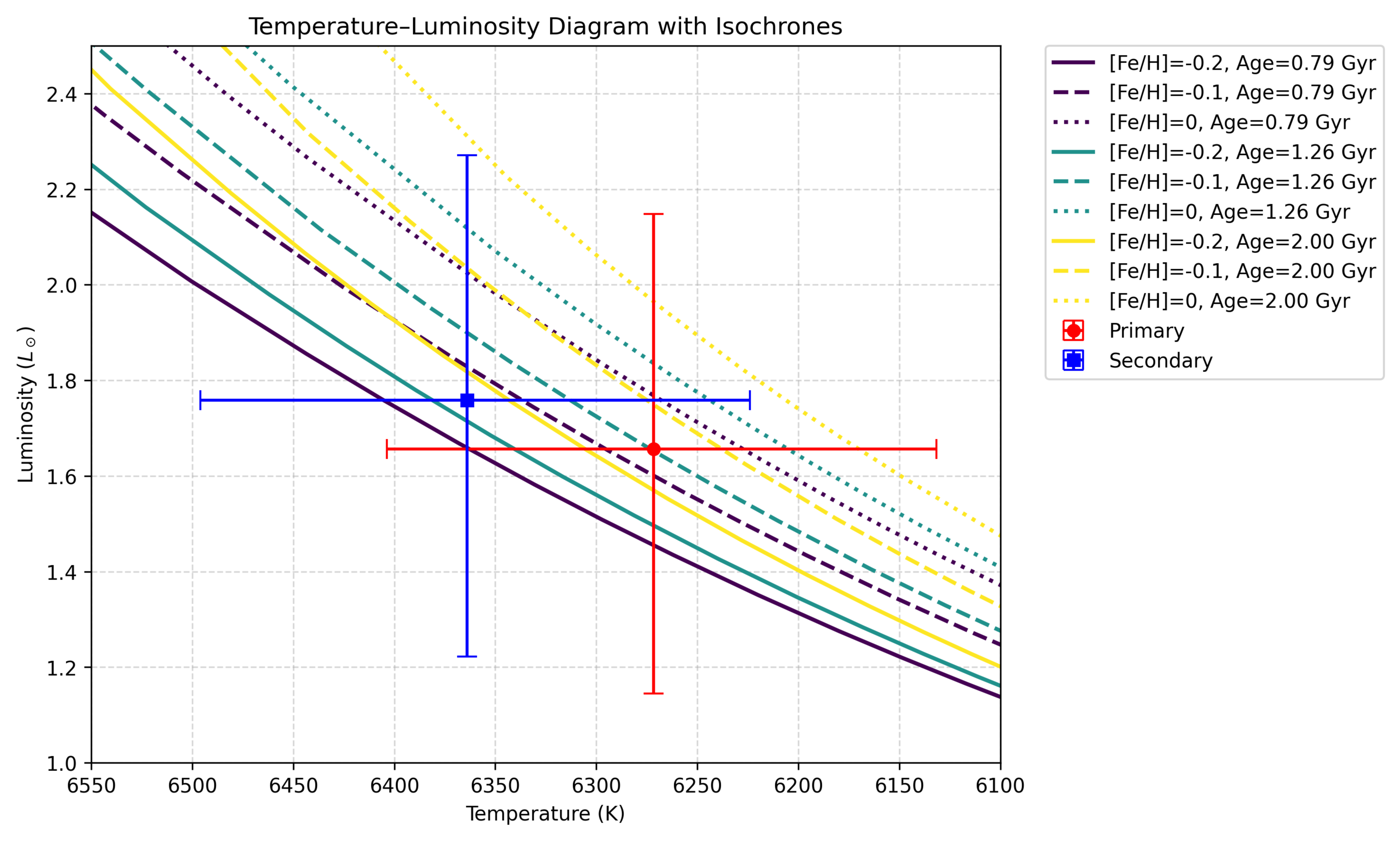 Comparison of the primary and secondary components with MIST isochrones in the Hertzsprung–Russell diagram. Theoretical isochrones for log10[age] = 8.9, 9.1, and 9.3 (0.79 Gyr, 1.26 Gyr, and 2.00 Gyr) and [Fe/H] = −0.2 to 0.0 are overlaid.