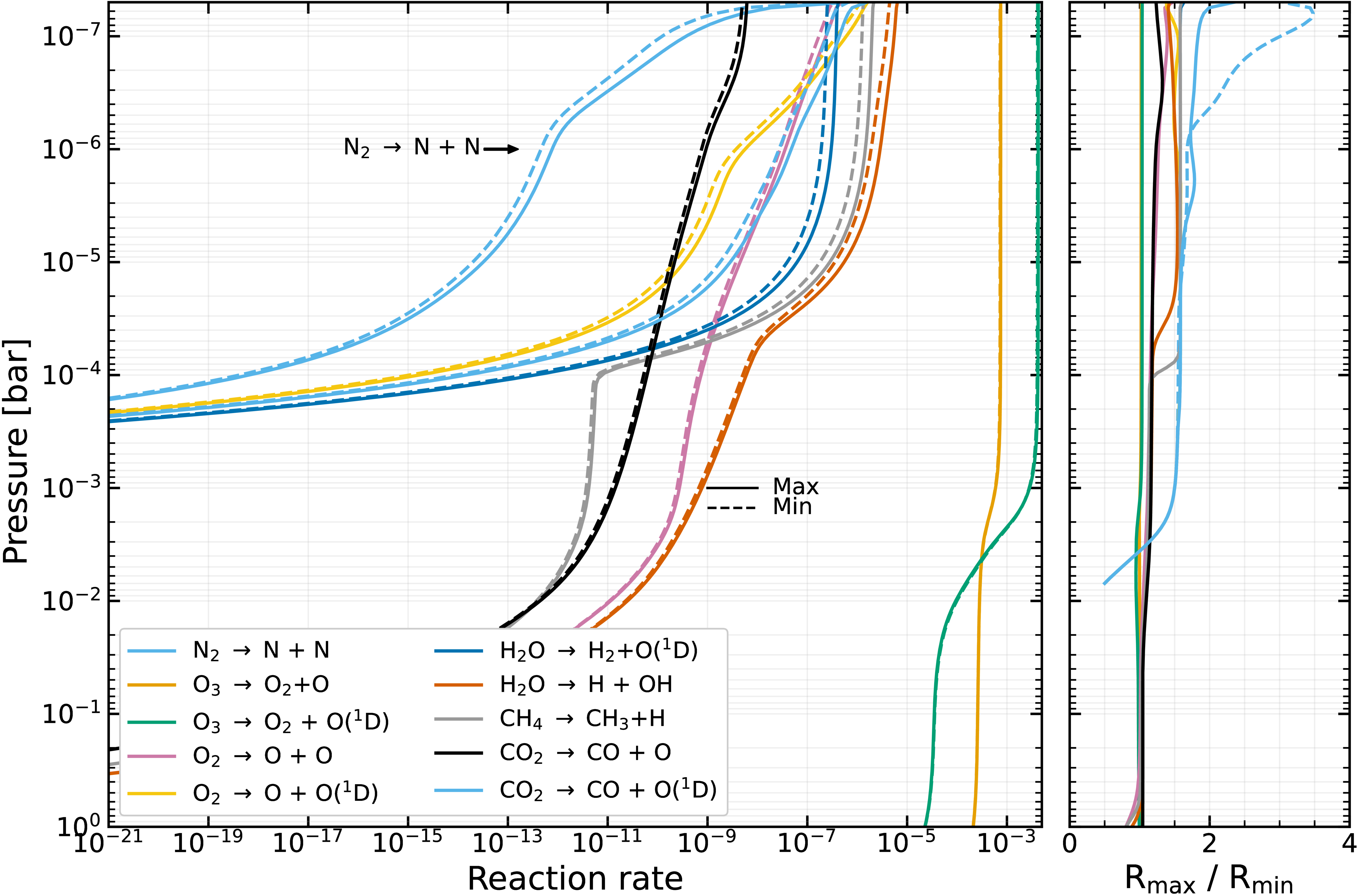 Left: reaction rates for select dissociation reactions in the hypothetical Earth-like planet’s atmosphere for both the maximum and minimum flux scenarios. Right: ratio of reaction rates between the maximum and minimum flux scenarios. The reaction N2 → N + N has been shown as a dashed line because it shares color with the CO2 → CO + O(1D) reaction.